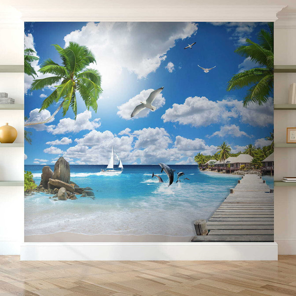 Τροπική παστέλ τέχνη με υφή, με πουλιά, πεταλούδες, λουλούδια ιβίσκου, φύλλα φοίνικα και δέντρα σε γαλάζιο φόντο.