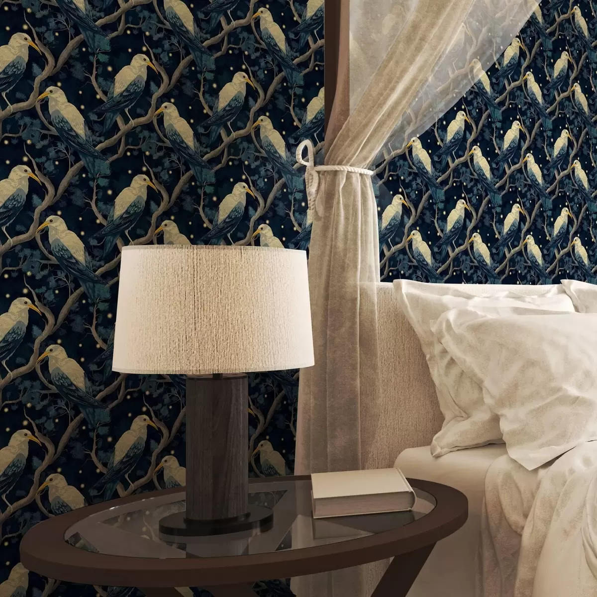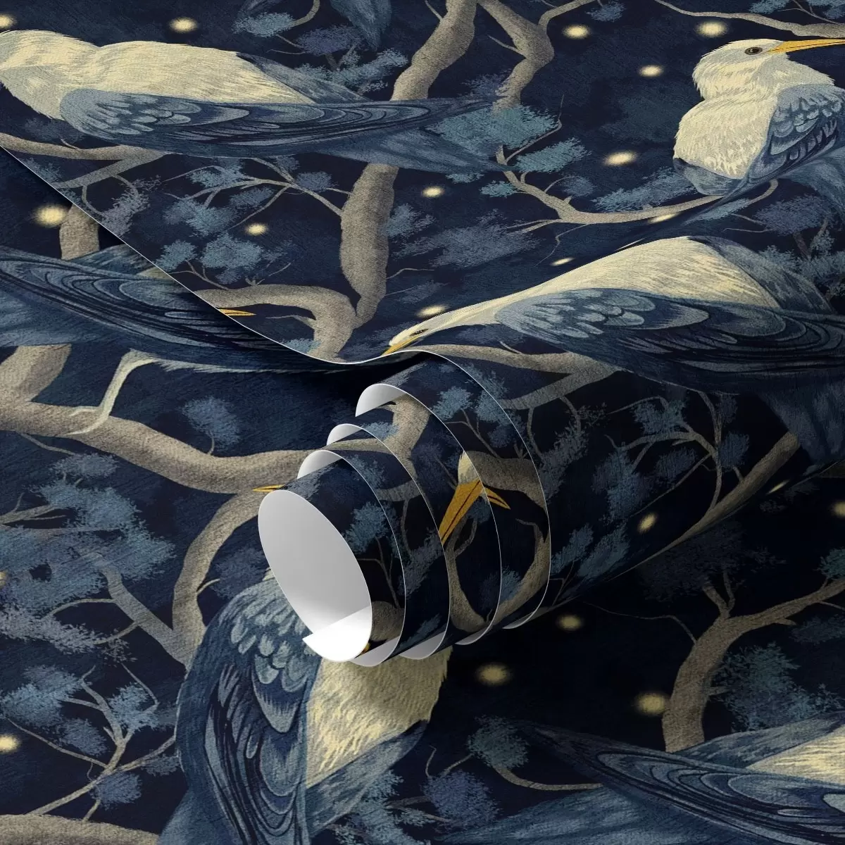 Ταπετσαρία Λευκά πουλιά σε κλαδιά ανάμεσα σε λαμπερές πυγολαμπίδες στο νυχτερινό δάσος Nr. a00109