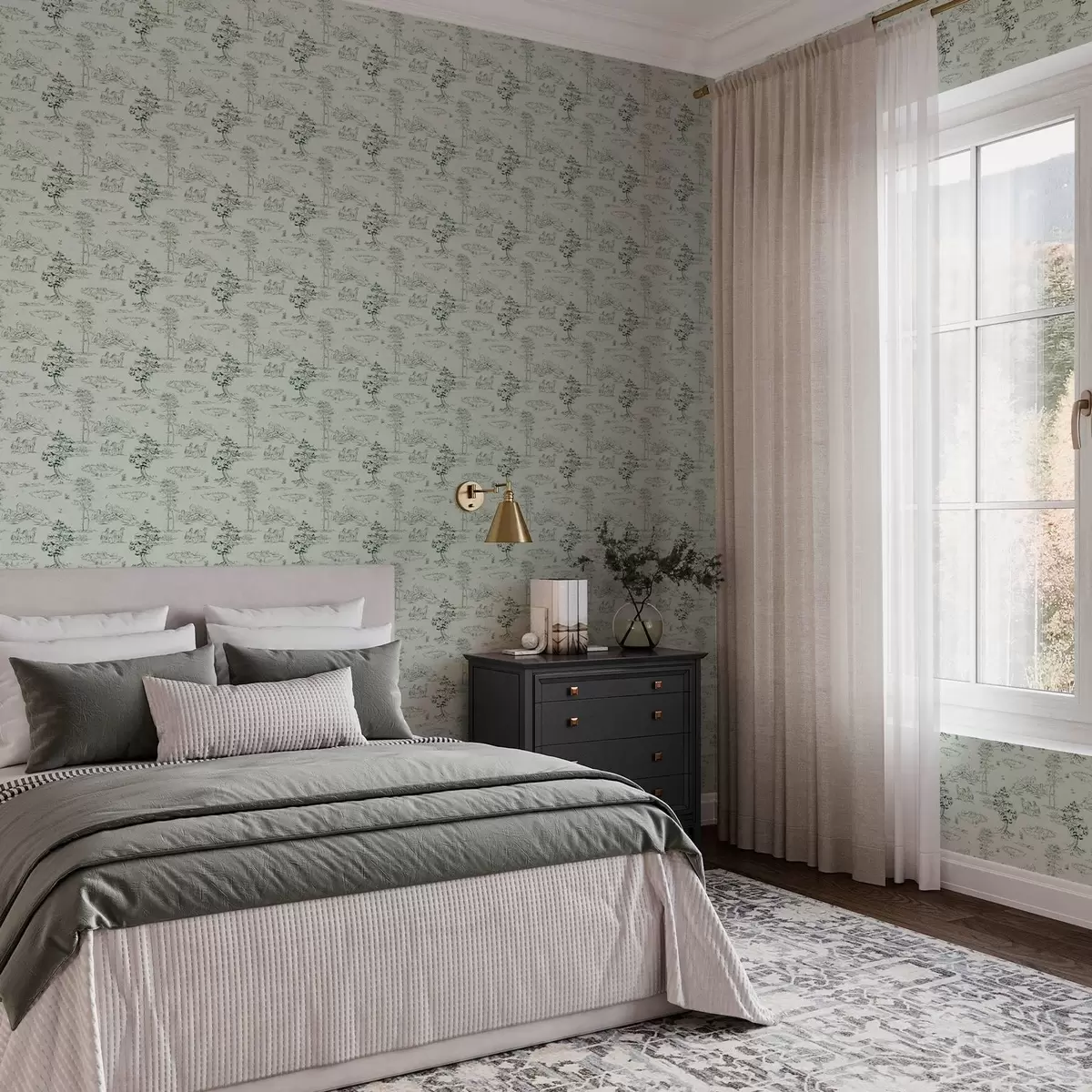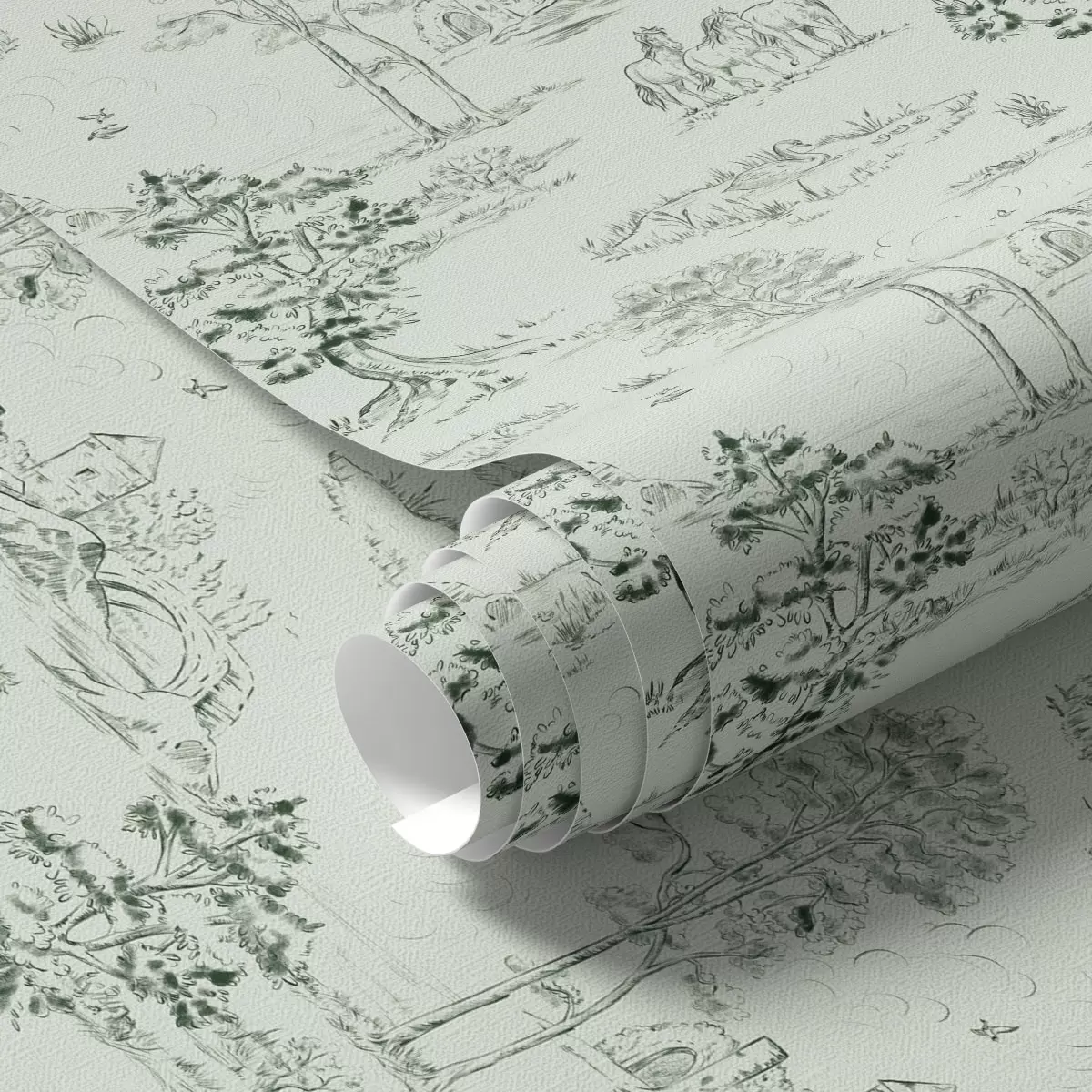 Ταπετσαρία Σκηνή με άλογα, δέντρα και κάστρο σε πράσινο φόντο Nr. a00133v1
