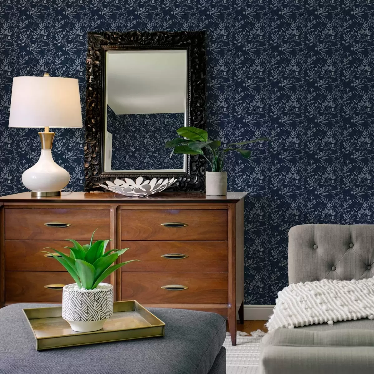 Ταπετσαρία Φωτεινή βοτανική εκτύπωση σε σκούρο φόντο Nr. a00166