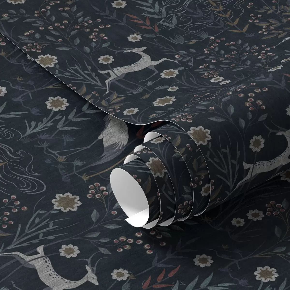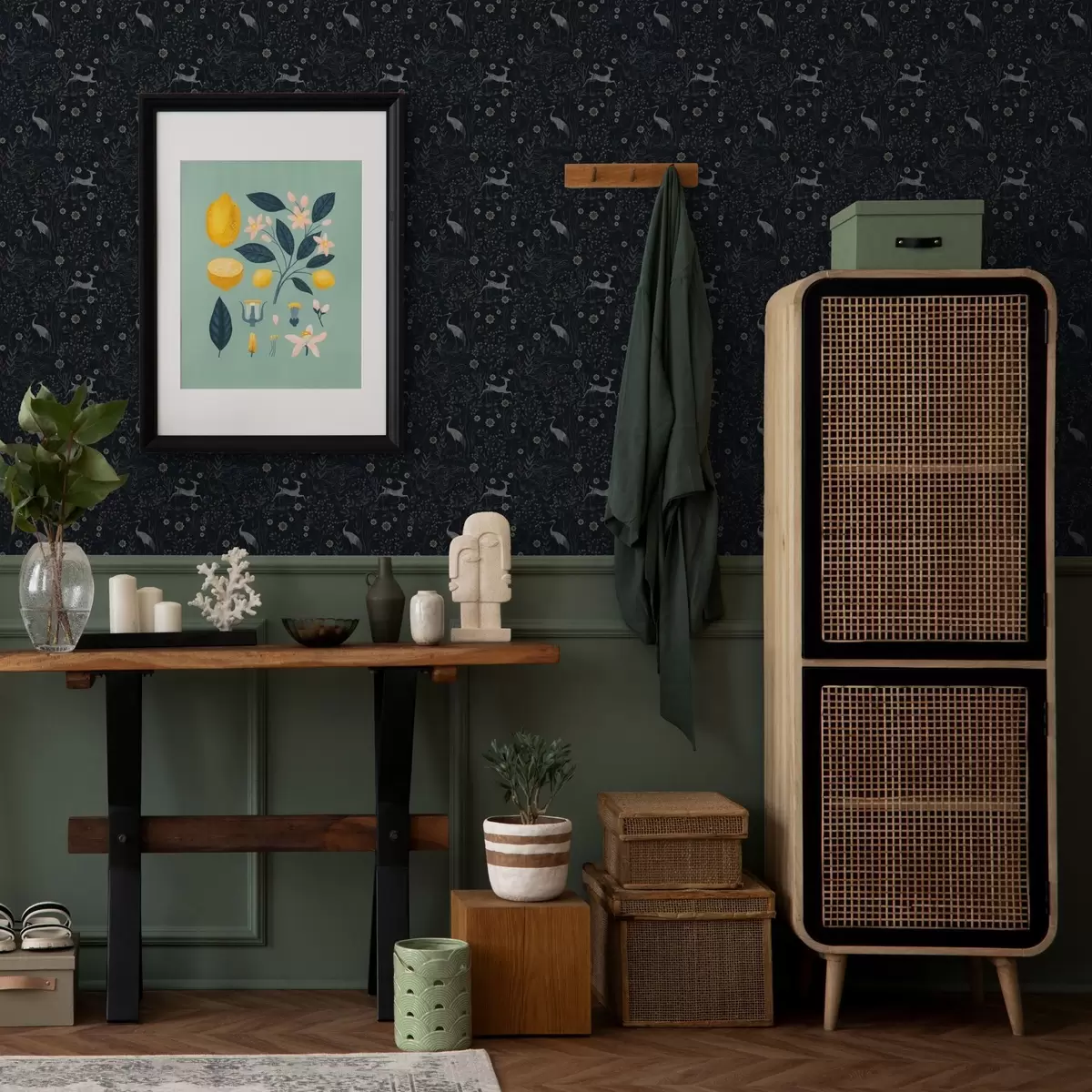 Ταπετσαρία Σκούρο φόντο με λευκά πουλιά και ελάφια Nr. a00363