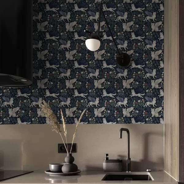 Ταπετσαρία Φαντασία γάτες με φτερά ανάμεσα σε λουλούδια Nr. a00408