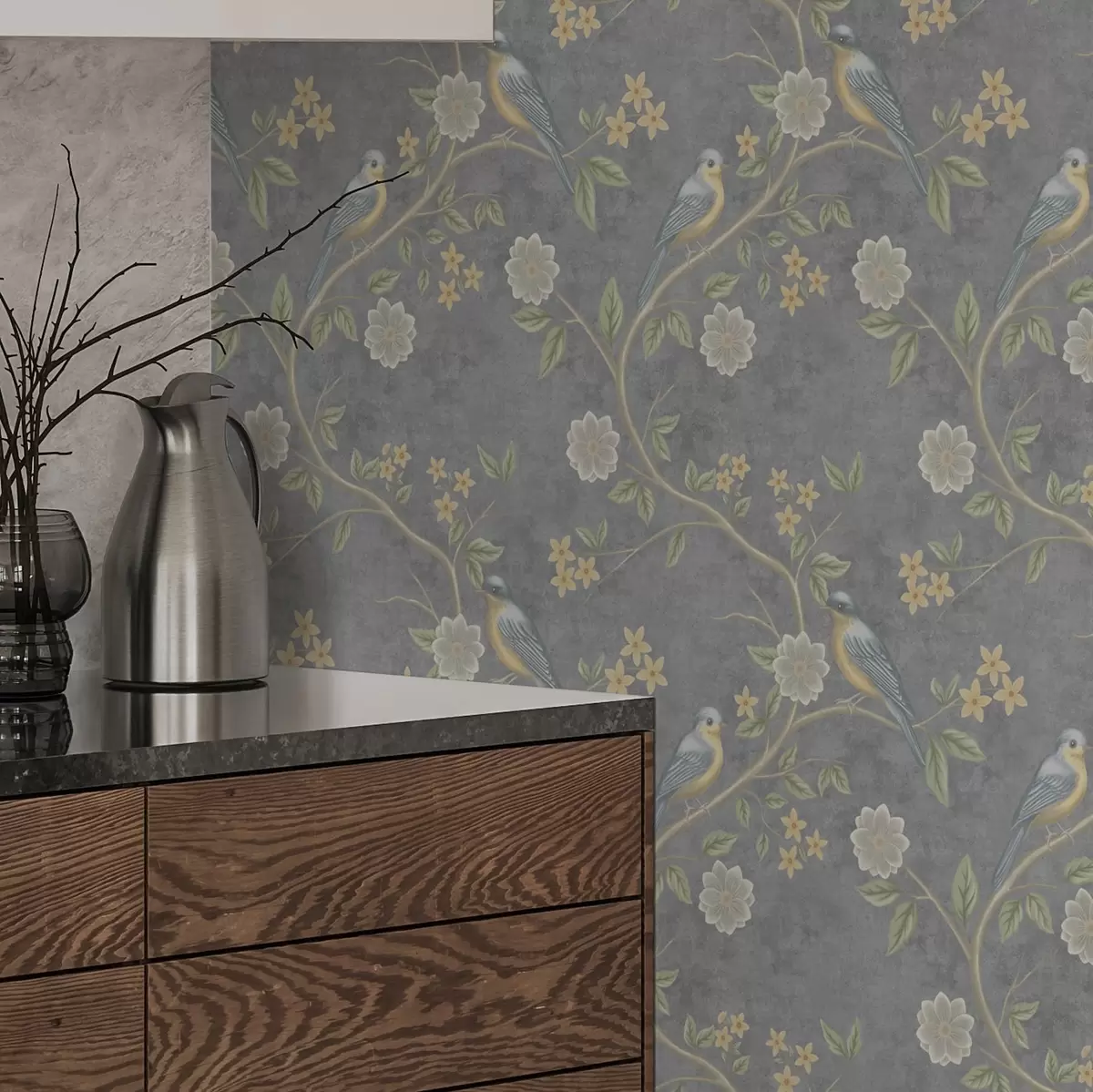 Ταπετσαρία Πουλιά σε κλαδιά ανάμεσα σε λουλούδια σε γκρι φόντο Nr. a00483