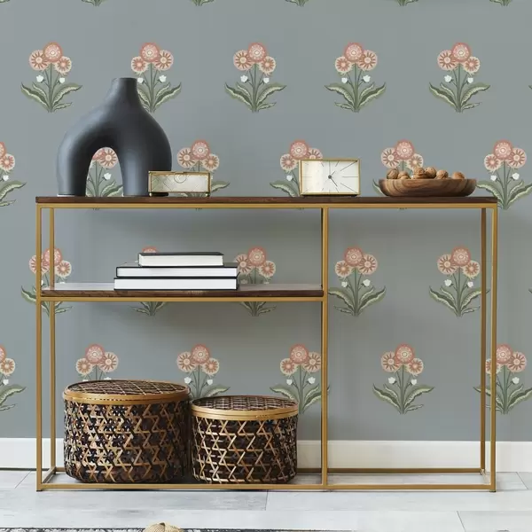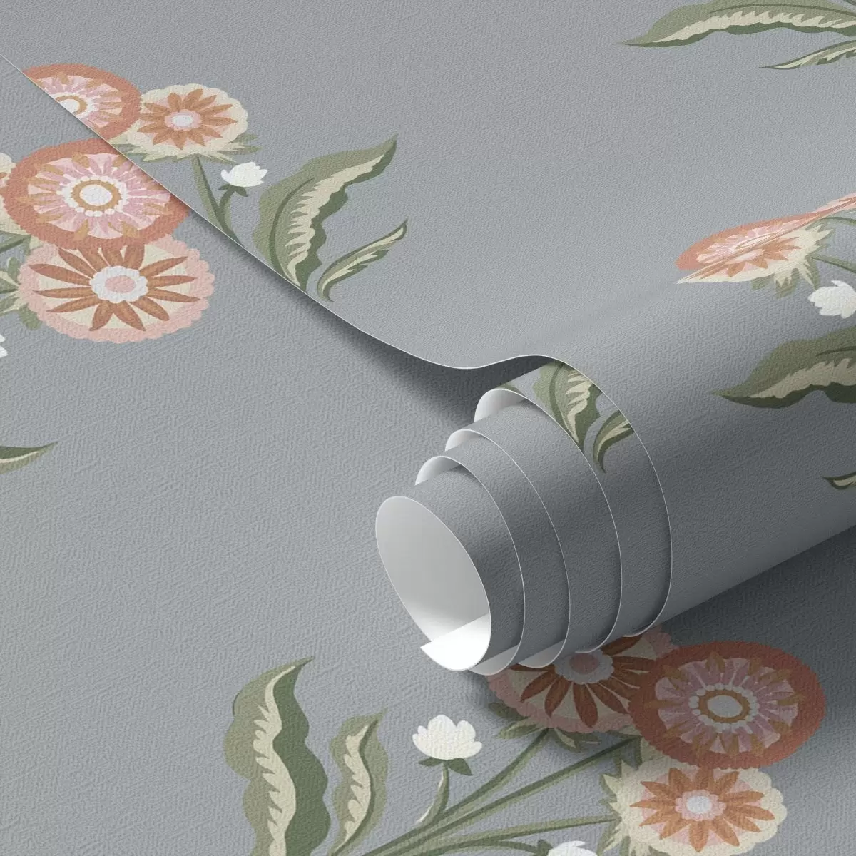 Ταπετσαρία Στυλιζαρισμένα λουλούδια σε γκρι-μπλε φόντο, ζεστή παλέτα Nr. a00494