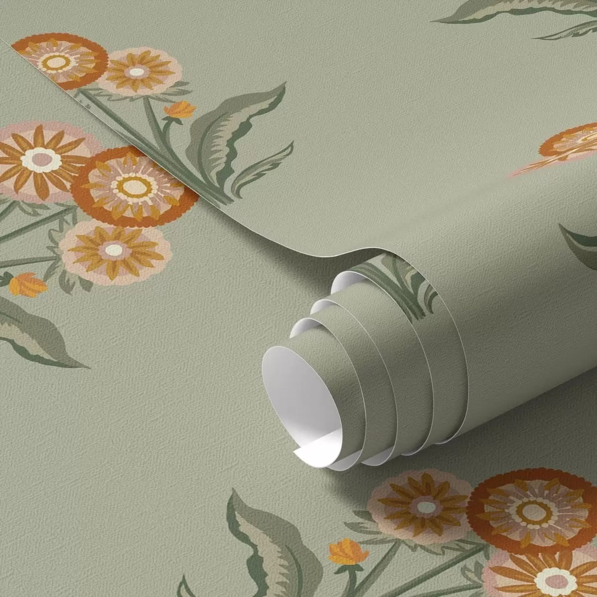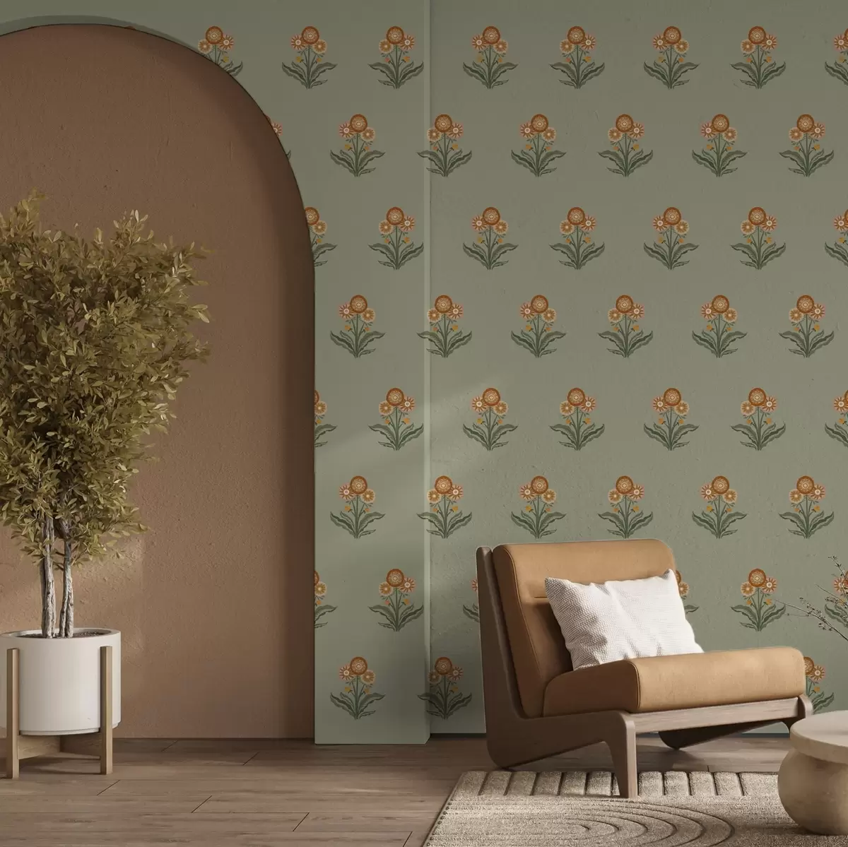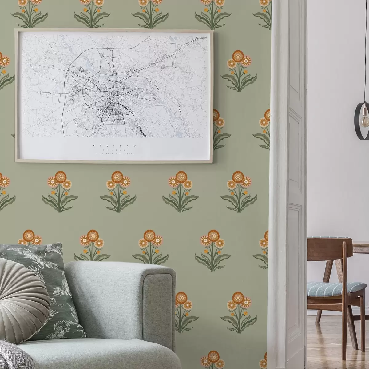 Ταπετσαρία Στυλιζαρισμένα λουλούδια σε φόντο ελιάς, ζεστούς τόνους Nr. a00494v2