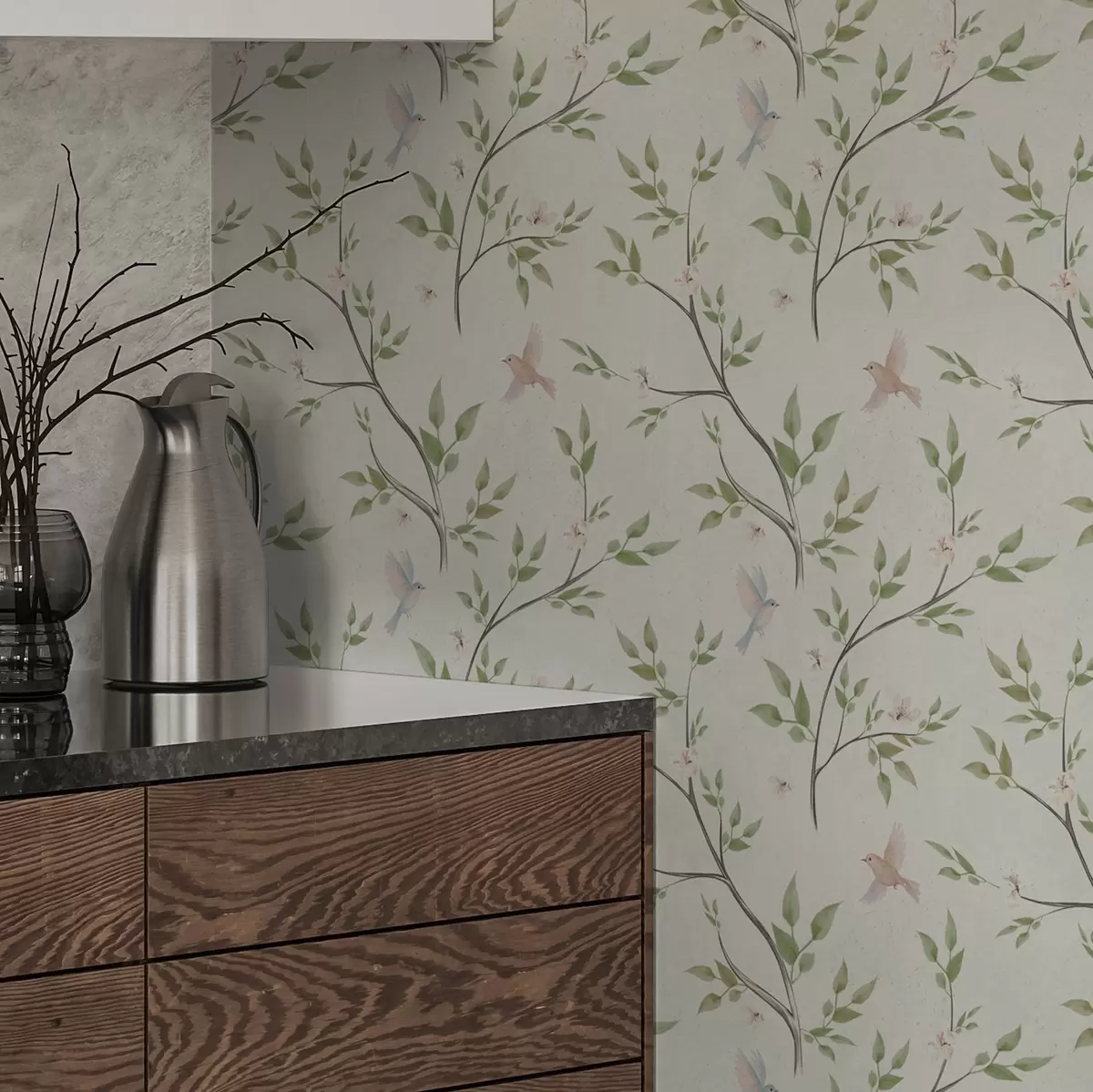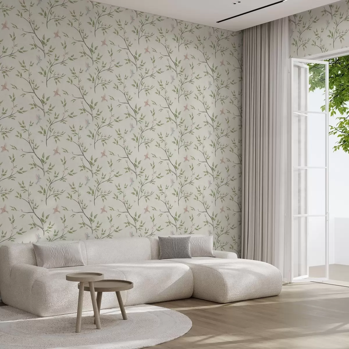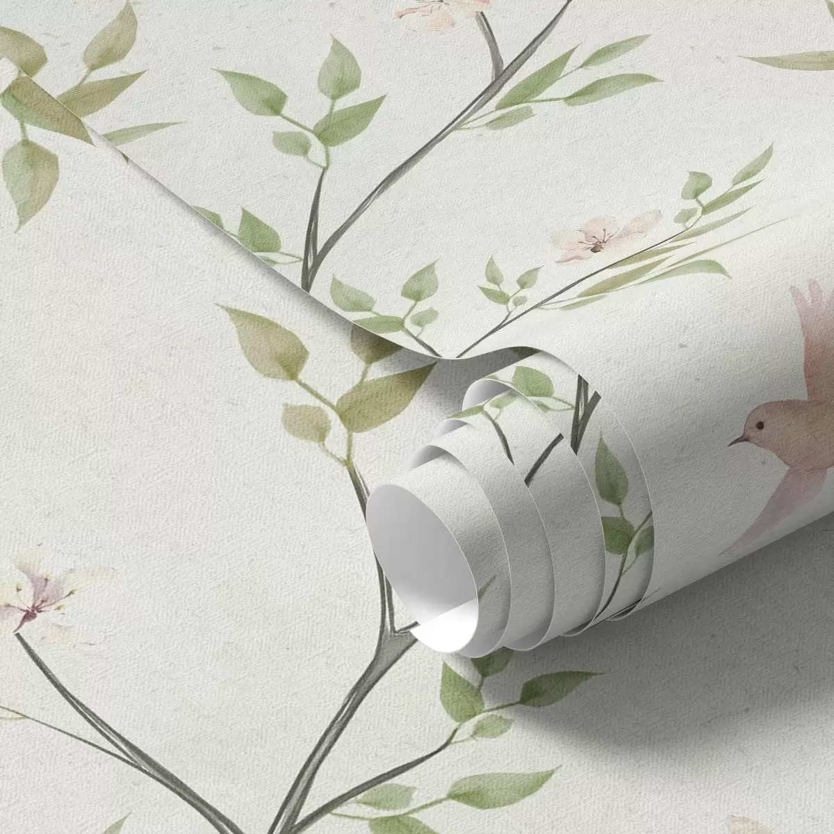 Ταπετσαρία Ακουαρέλα με κλαδιά με φύλλα και πουλιά σε ανοιχτόχρωμο φόντο Nr. a00496