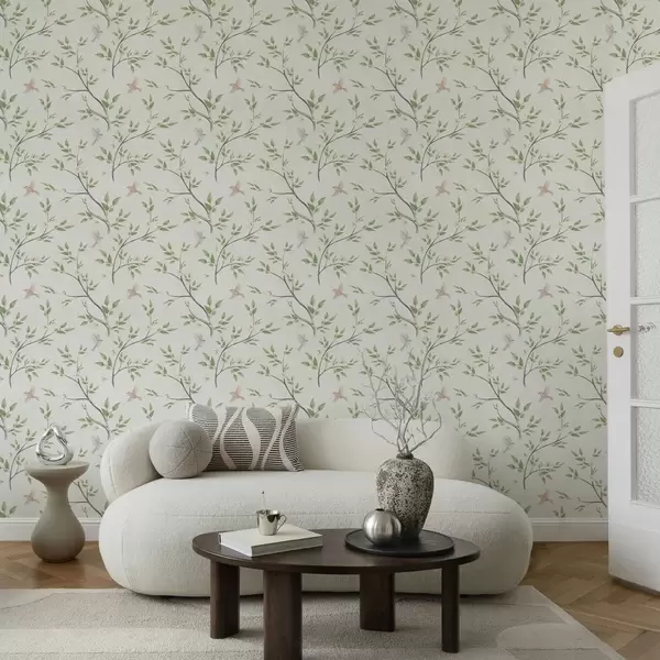 Ταπετσαρία Ακουαρέλα με κλαδιά με φύλλα και πουλιά σε ανοιχτόχρωμο φόντο Nr. a00496