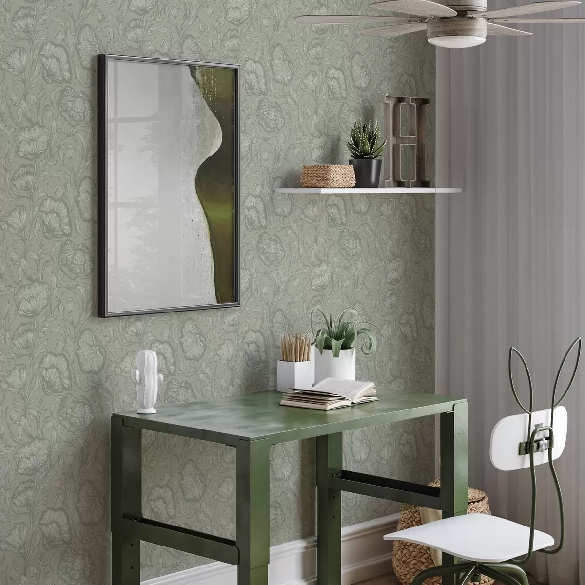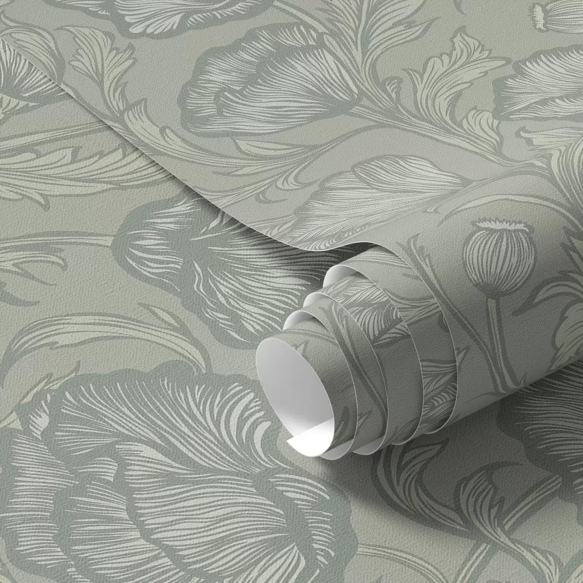 Ταπετσαρία Γραμμικά σχέδια παπαρούνων σε γκρι-πράσινο φόντο Nr. a00572v1