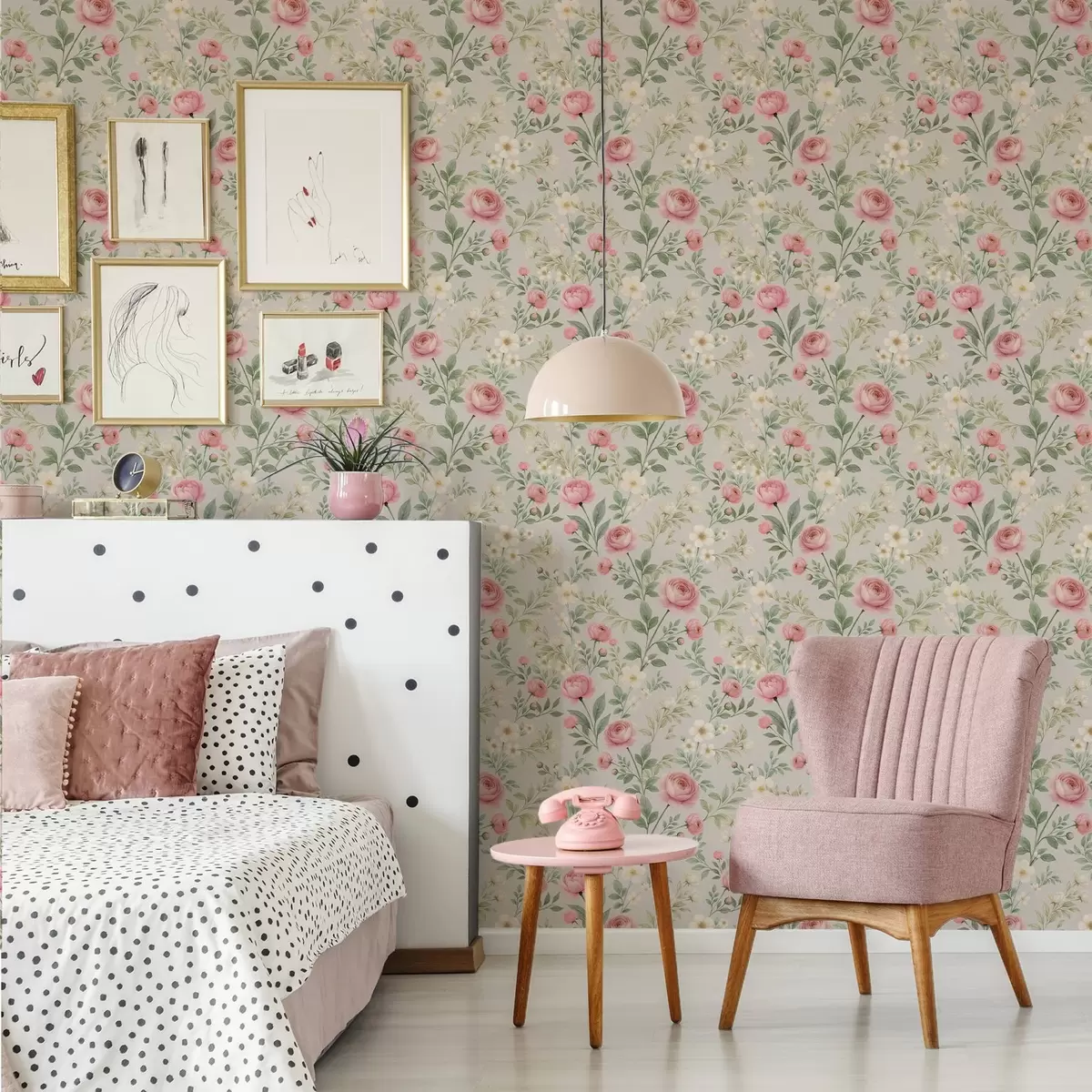 Ταπετσαρία Ακουαρέλα με παιώνιες και λευκά λουλούδια σε γκρι-μπεζ φόντο Nr. a00592