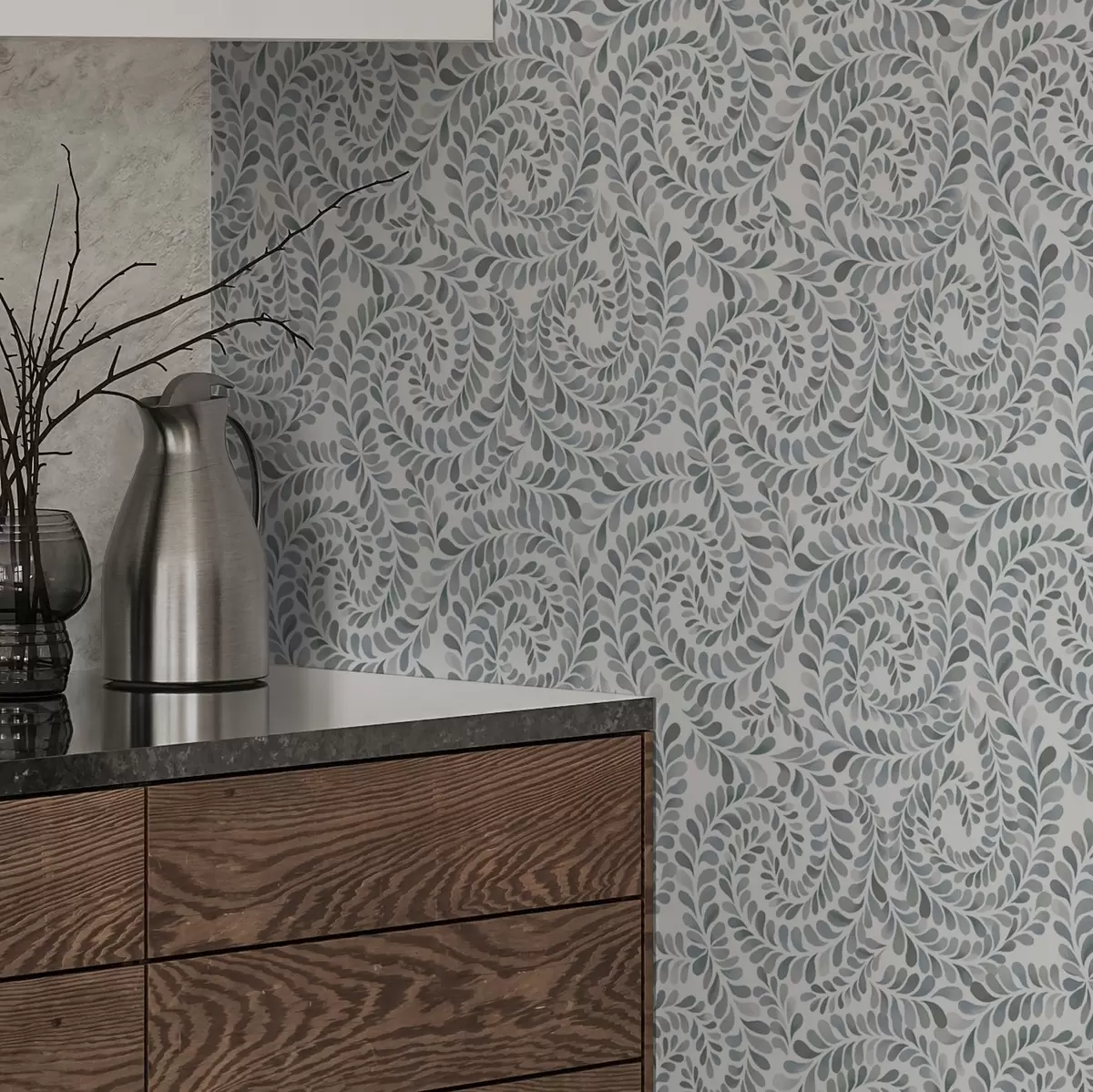 Ταπετσαρία Φυλλώδεις σπείρες σε δροσερούς γκρι-μπλε τόνους Nr. a00602v1