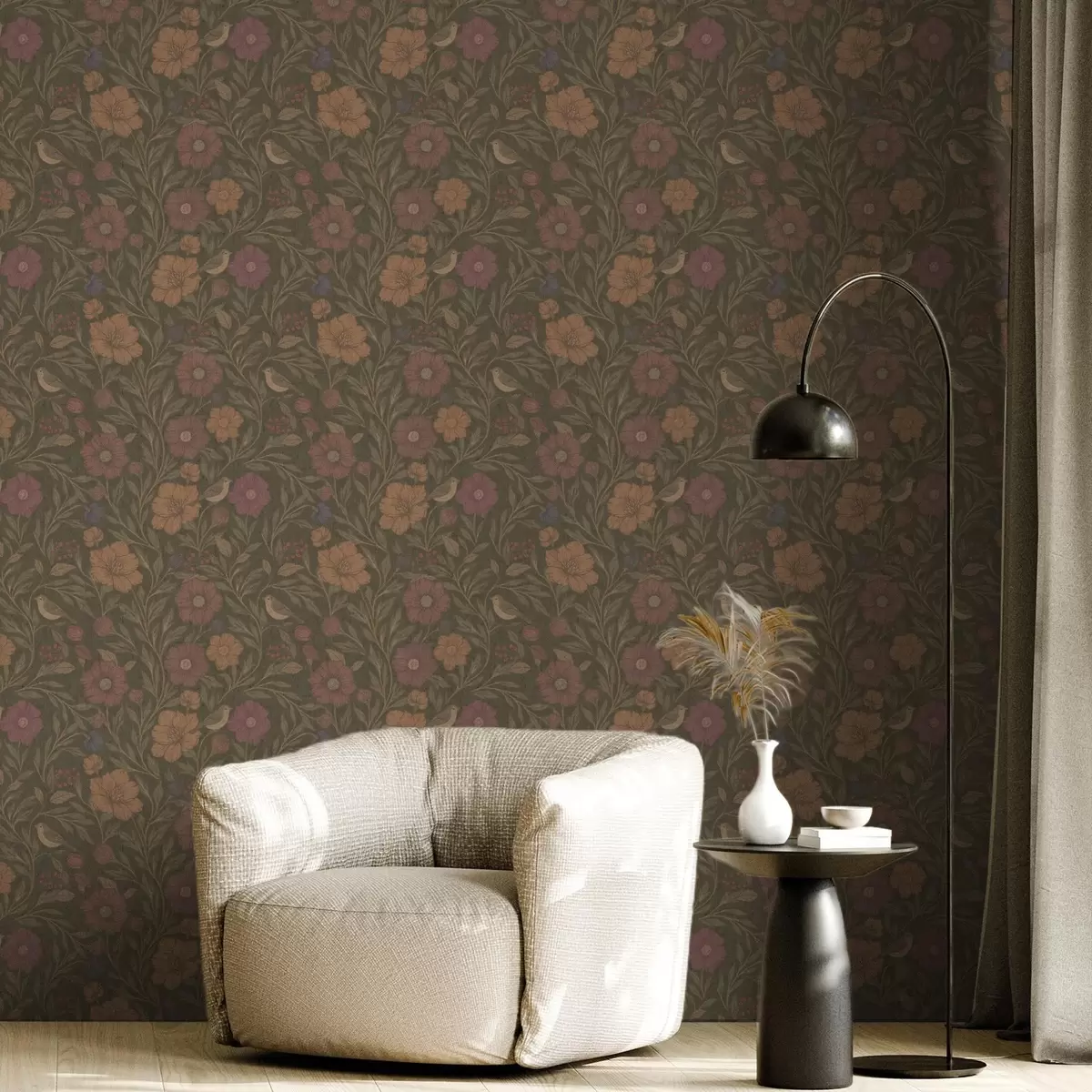 Ταπετσαρία Φθινοπωρινά λουλούδια και πουλιά σε φόντο καφέ-ελιάς Nr. a00605
