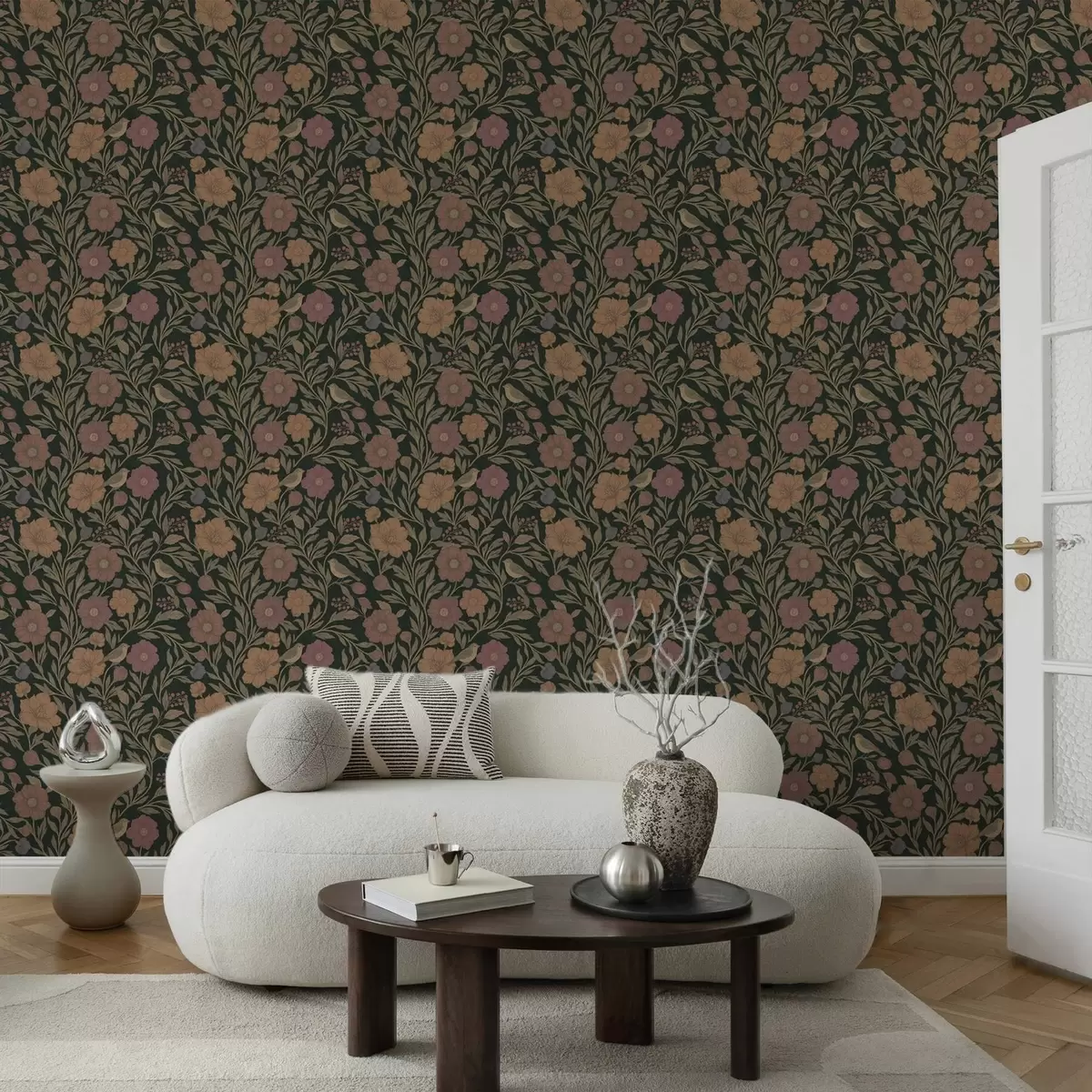 Ταπετσαρία Φθινοπωρινά λουλούδια και πουλιά σε βαθύ σμαραγδένιο φόντο Nr. a00605v1