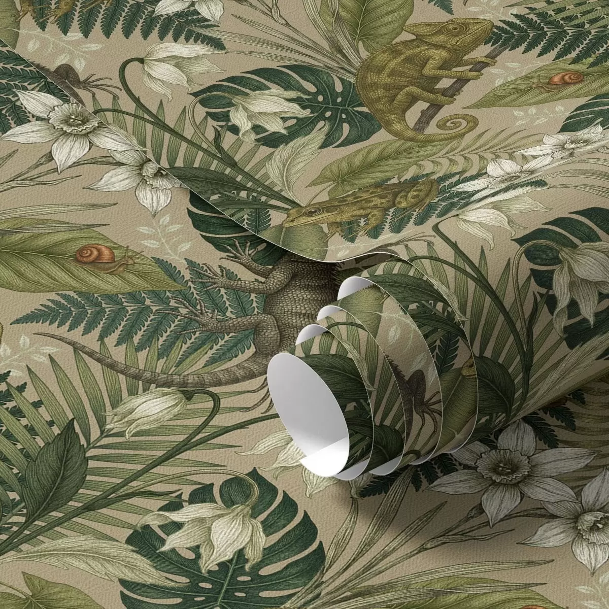 Ταπετσαρία Χαμαιλέοντες και τροπικά φύλλα, λευκά λουλούδια, μπεζ φόντο Nr. a00608