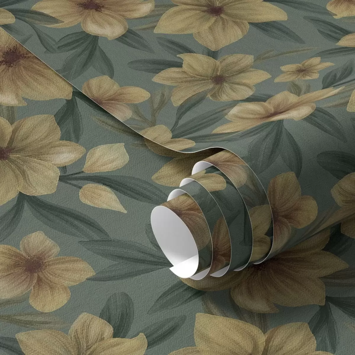 Ταπετσαρία Ωχρά λουλούδια σε βαθύ πράσινο φόντο, πυκνό μοτίβο Nr. a00628
