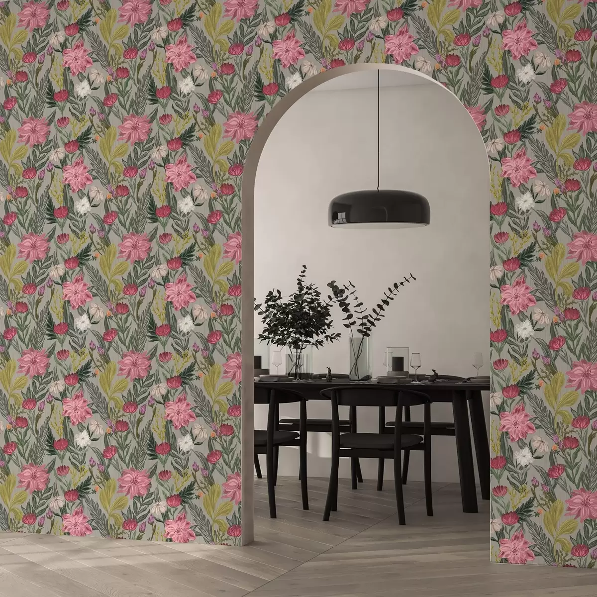 Ταπετσαρία Πλούσια ροζ και κρεμ λουλούδια σε γκρι φόντο, υφή παχιάς βαφής Nr. a00629