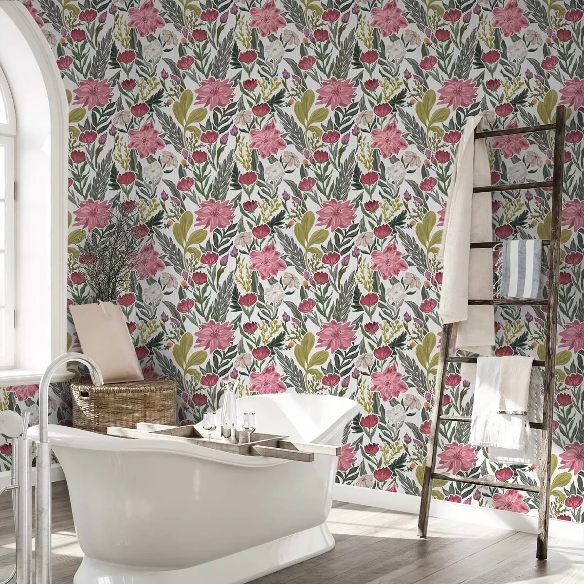 Ταπετσαρία Πλούσια ροζ και κρεμ λουλούδια σε λευκό φόντο, υφή παχιάς βαφής Nr. a00629v1