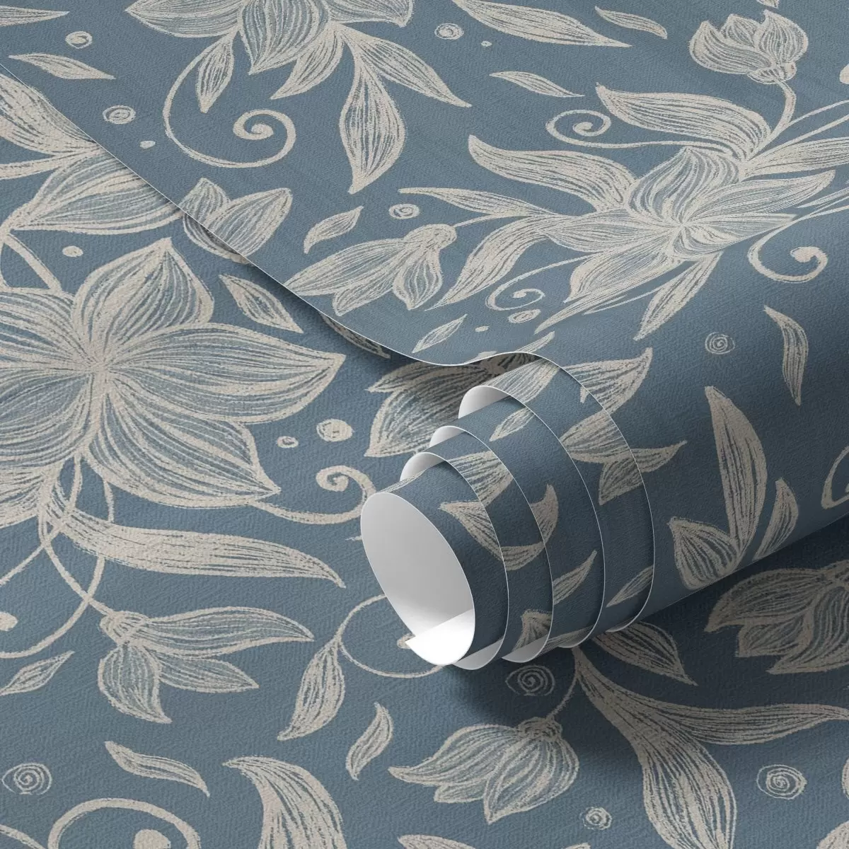Ταπετσαρία Κρεμ λουλούδια σε μπλε φόντο, λεπτεπίλεπτα σπειροειδή σχέδια Nr. a00630