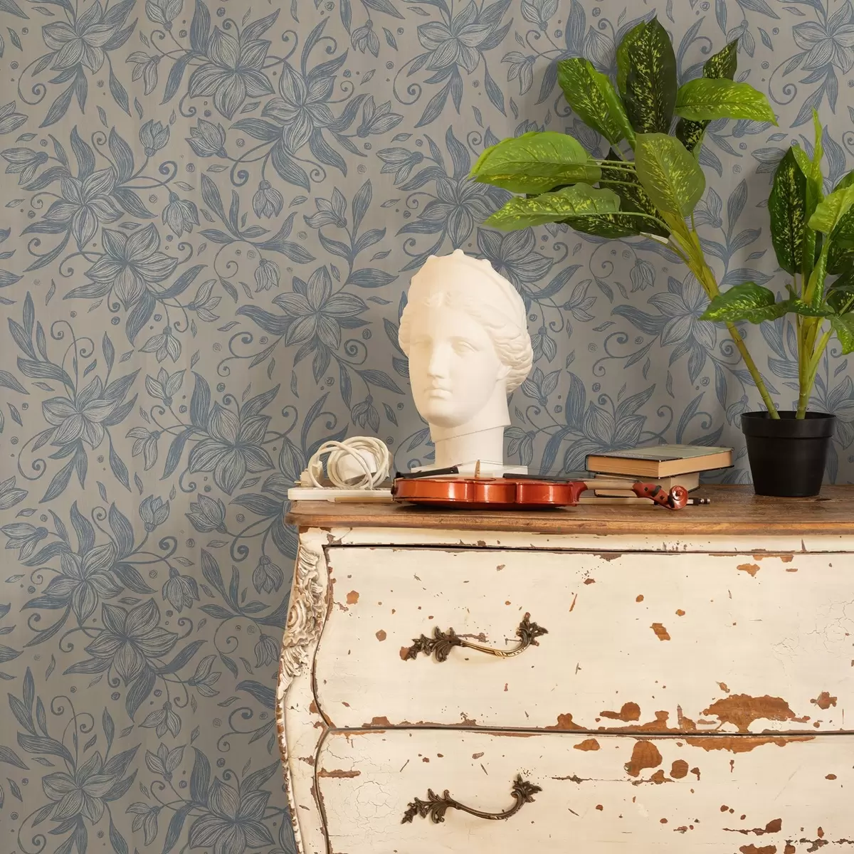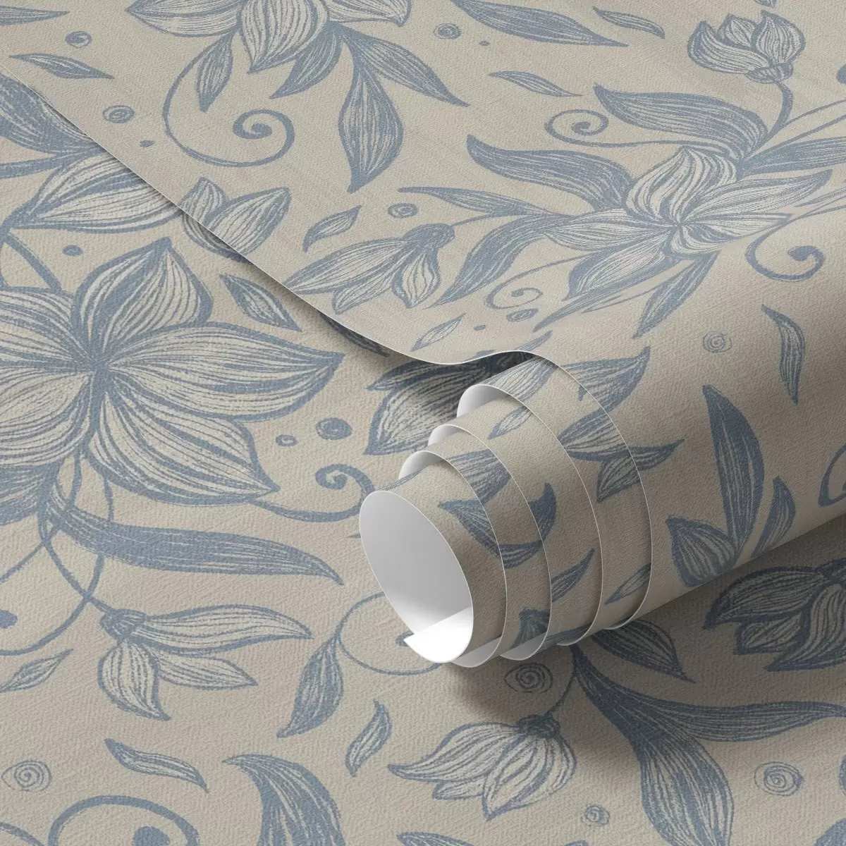 Ταπετσαρία Μπλε γραμμικό floral μοτίβο σε ζεστό μπεζ χρώμα Nr. a00630v2