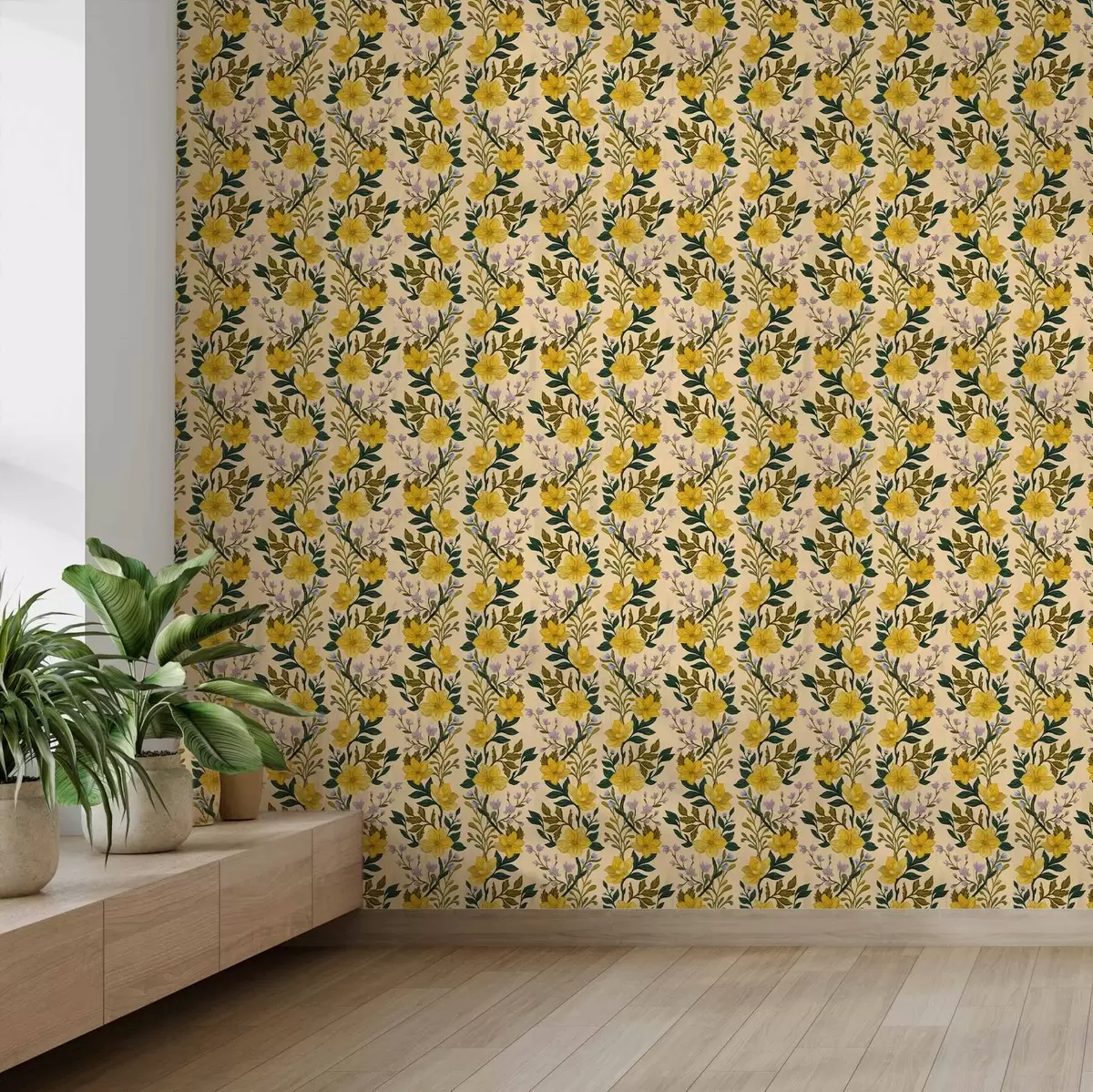 Ταπετσαρία Κίτρινα λουλούδια σε κάθετες γιρλάντες σε κρεμ φόντο Nr. a00632