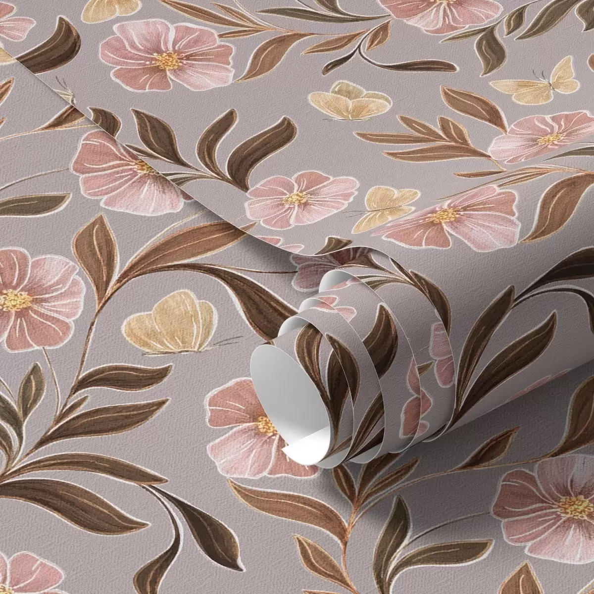 Ταπετσαρία Ροζ λουλούδια και πεταλούδες σε γκρι-μπεζ φόντο Nr. a00633
