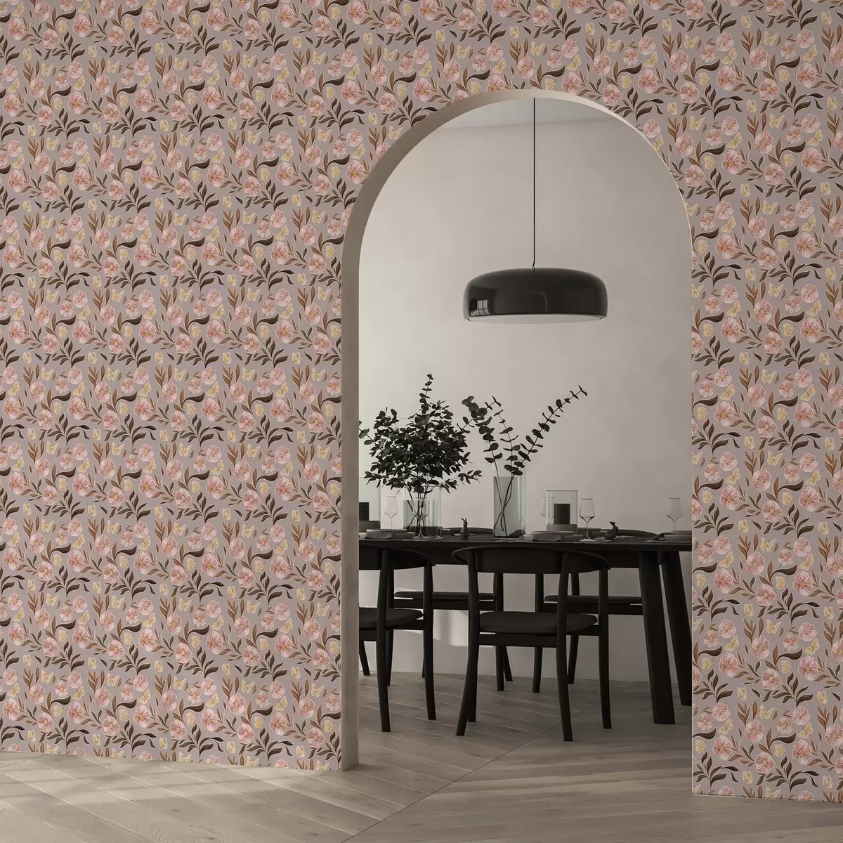 Ταπετσαρία Ροζ λουλούδια και πεταλούδες σε γκρι-μπεζ φόντο Nr. a00633