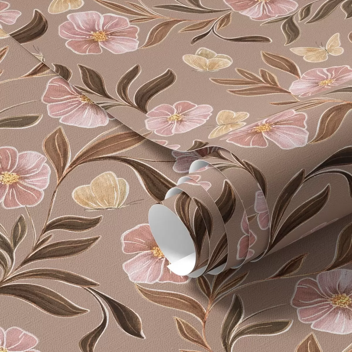Ταπετσαρία Ροζ λουλούδια και πεταλούδες σε ζεστό καφέ φόντο Nr. a00633v1