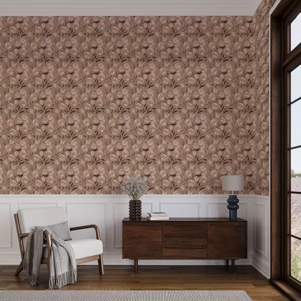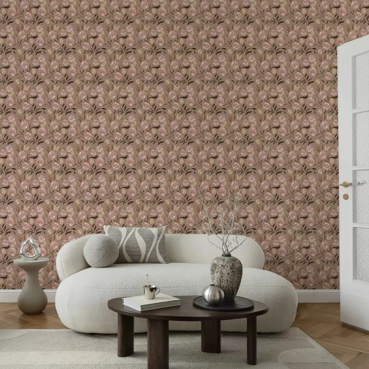 Ταπετσαρία Ροζ λουλούδια και πεταλούδες σε ζεστό καφέ φόντο Nr. a00633v1