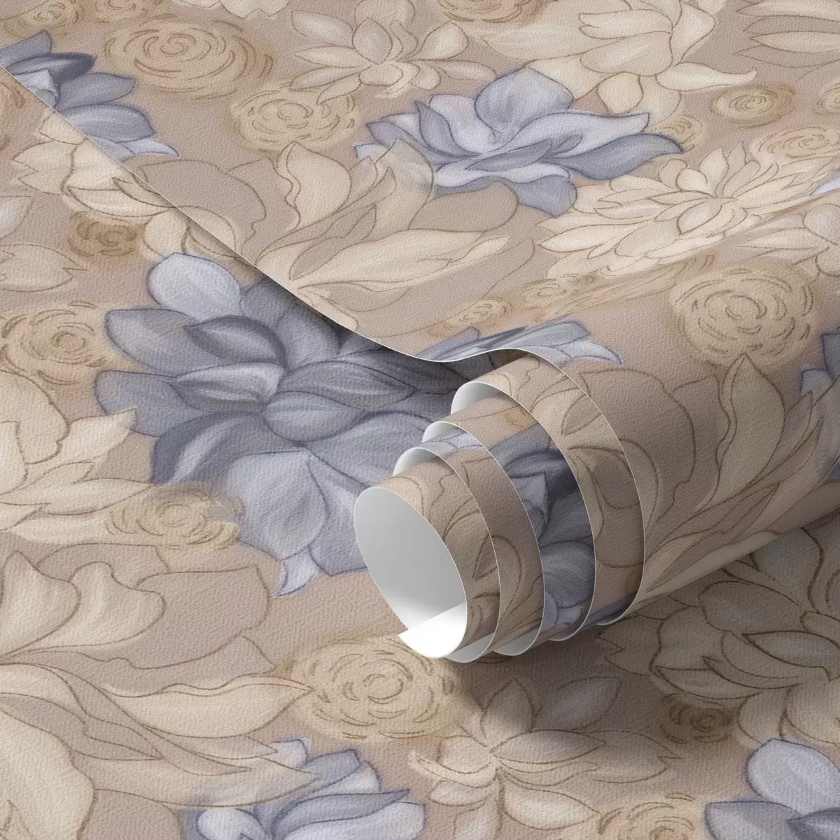 Ταπετσαρία Κρέμα και μπλε λουλούδια σε ζεστό μπεζ φόντο Nr. a00634v1