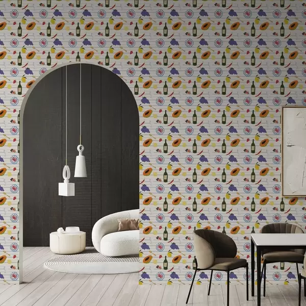 Ταπετσαρία Εκτύπωση κουζίνας με φρούτα, ποτήρια και πιάτα Nr. a00638