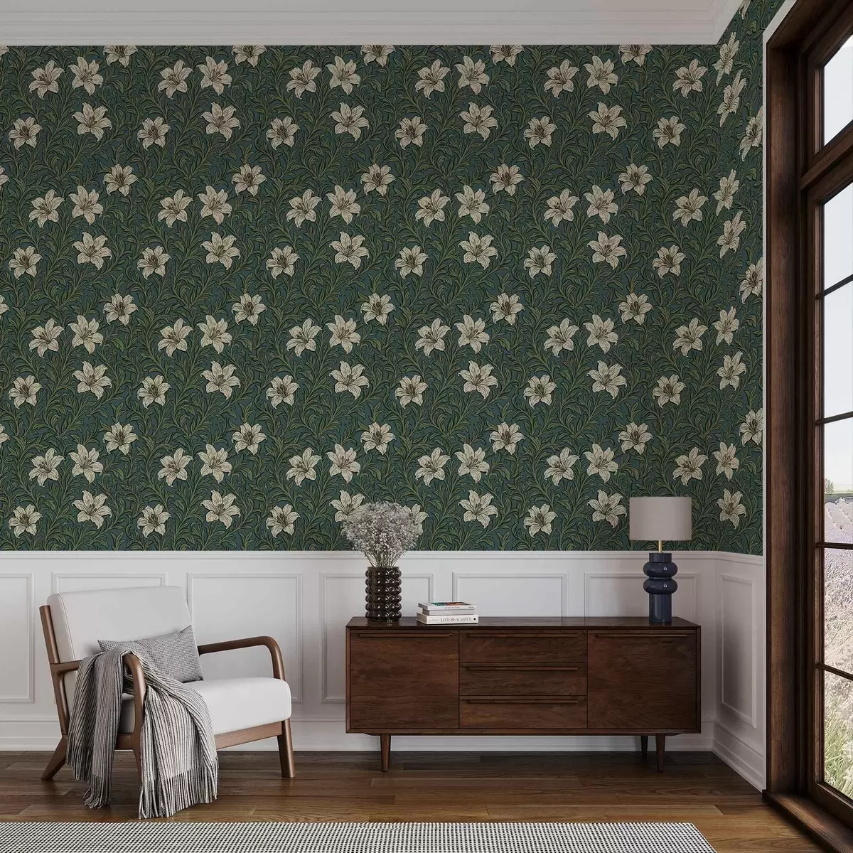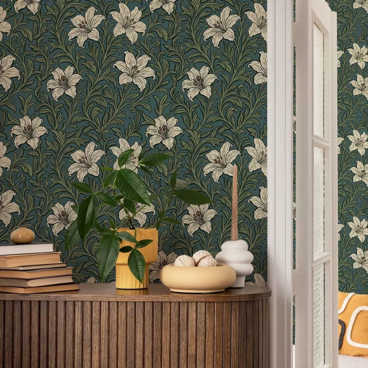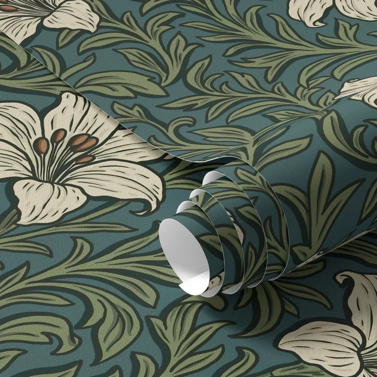 Ταπετσαρία Κρεμ κρίνους ανάμεσα σε πυκνή βλάστηση σε τυρκουάζ φόντο Nr. a00645