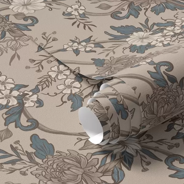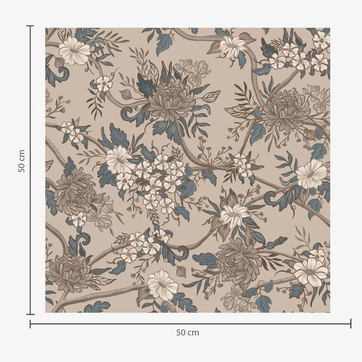 Ταπετσαρία Μεγάλα λουλούδια με μοτίβα φύλλων σε ζεστό μπεζ φόντο Nr. a00649