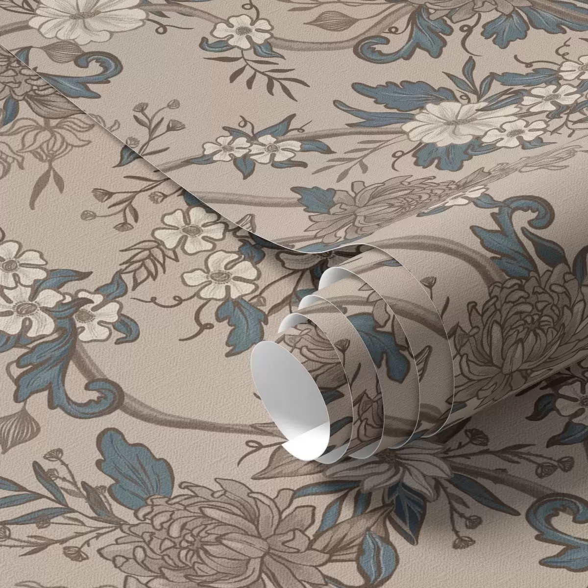 Ταπετσαρία Μεγάλα λουλούδια με μοτίβα φύλλων σε ζεστό μπεζ φόντο Nr. a00649