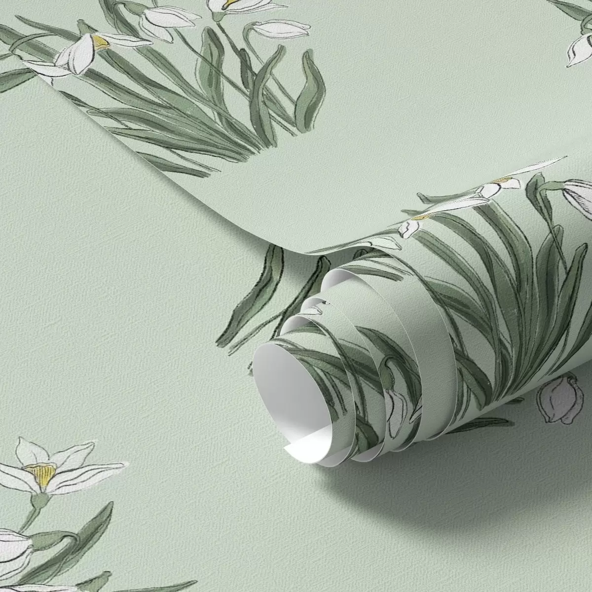 Ταπετσαρία Χιονάνθη με πράσινα φύλλα σε ζεστό κίτρινο φόντο Nr. a00651v3