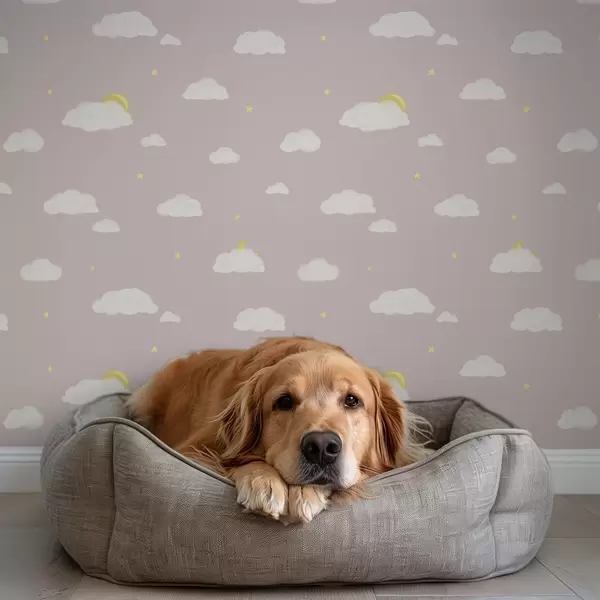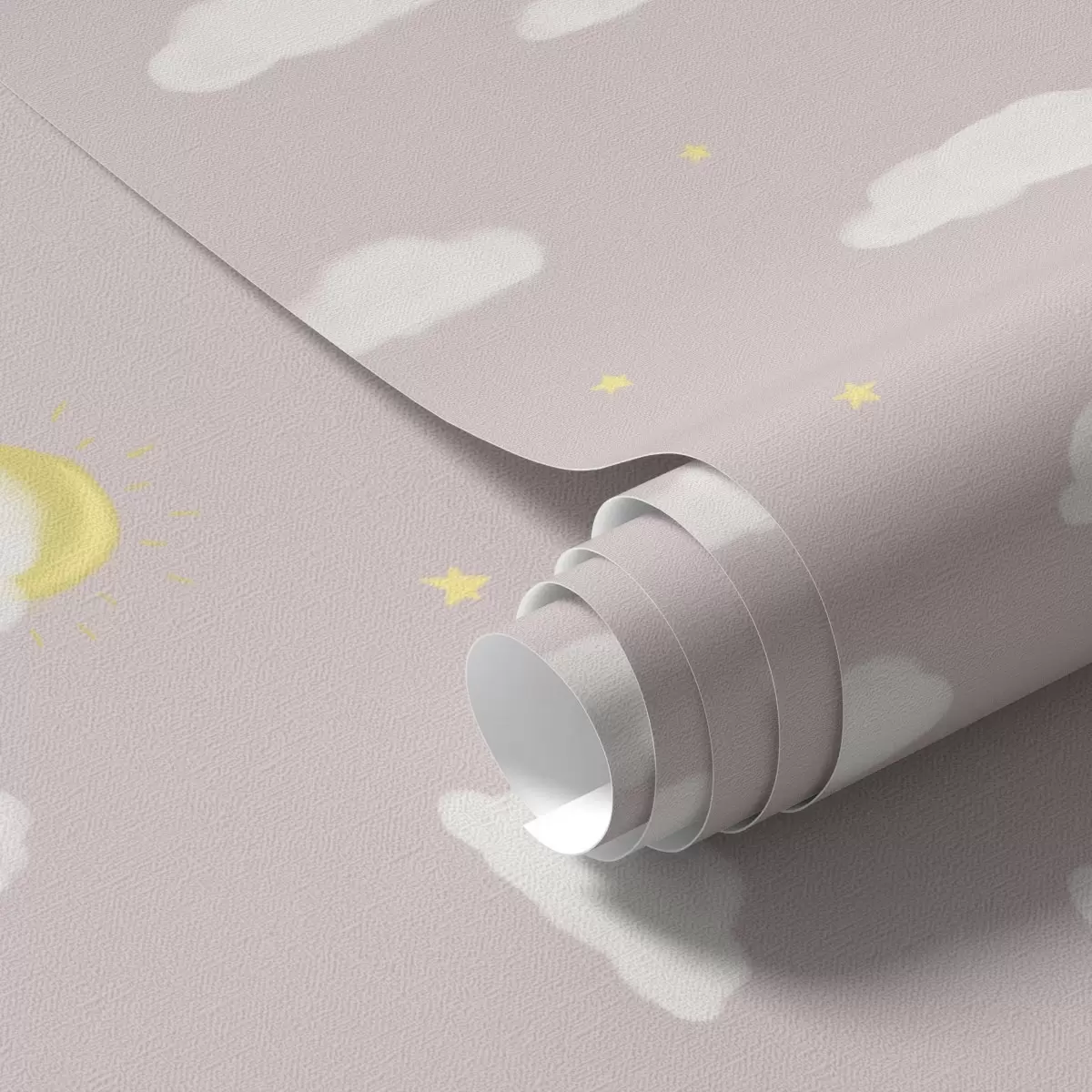 Ταπετσαρία Απαλά σύννεφα, αστέρια και ήλιος σε ροζ-γκρι φόντο Nr. a00652v2