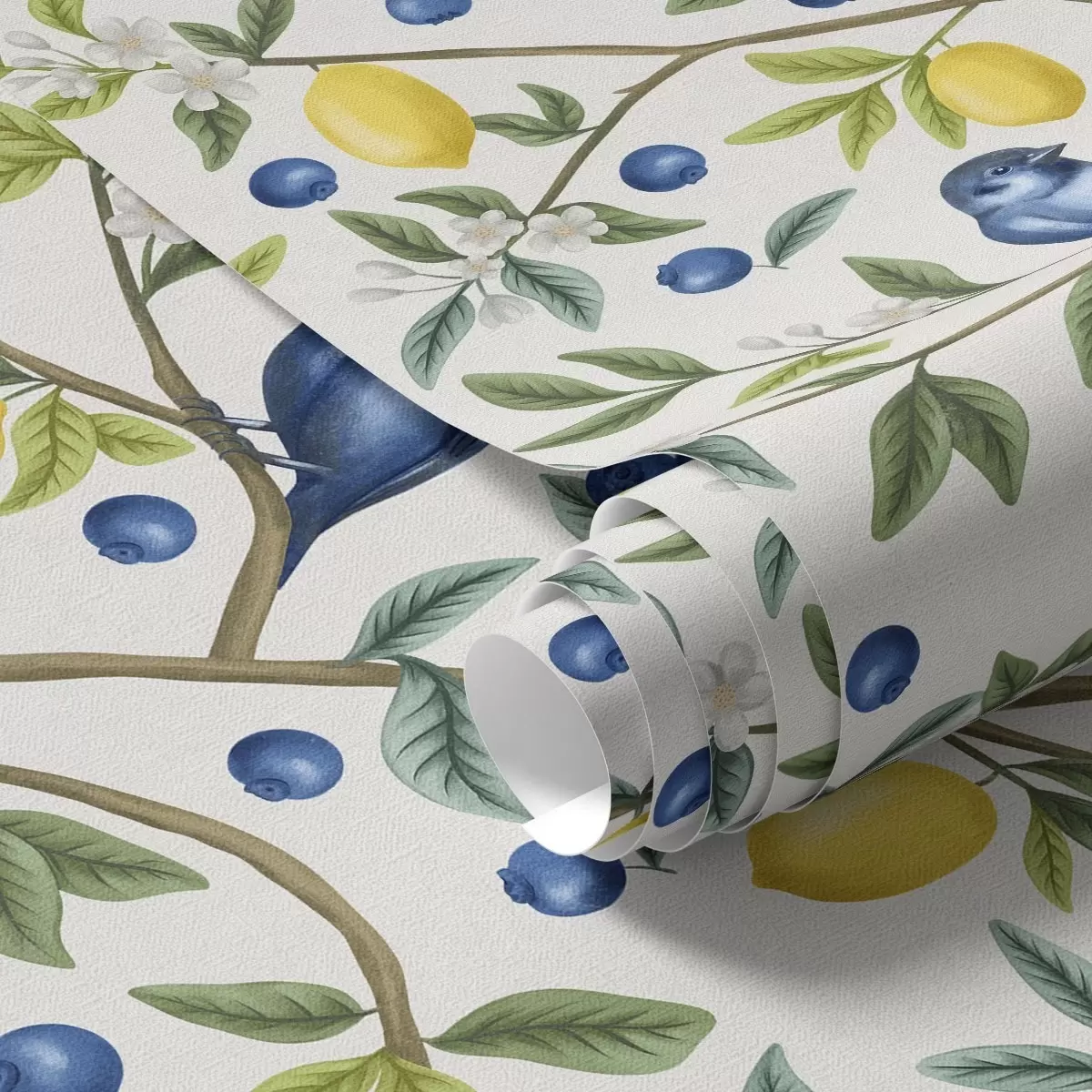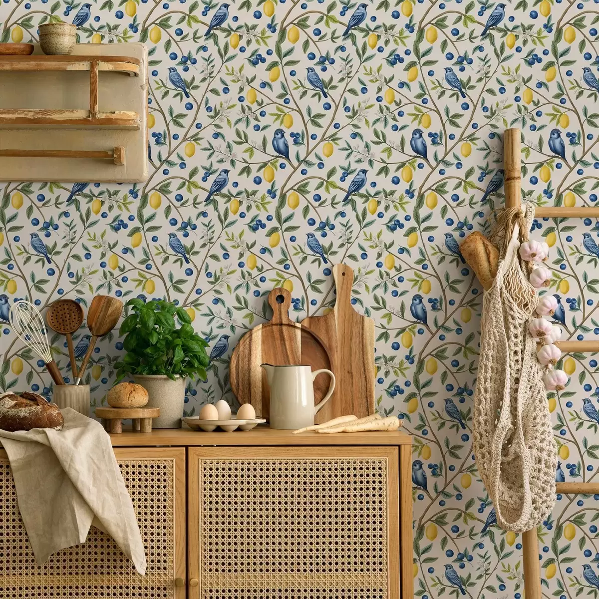 Ταπετσαρία Μπλε πουλιά, λεμόνια και μούρα σε λευκό φόντο Nr. a00668