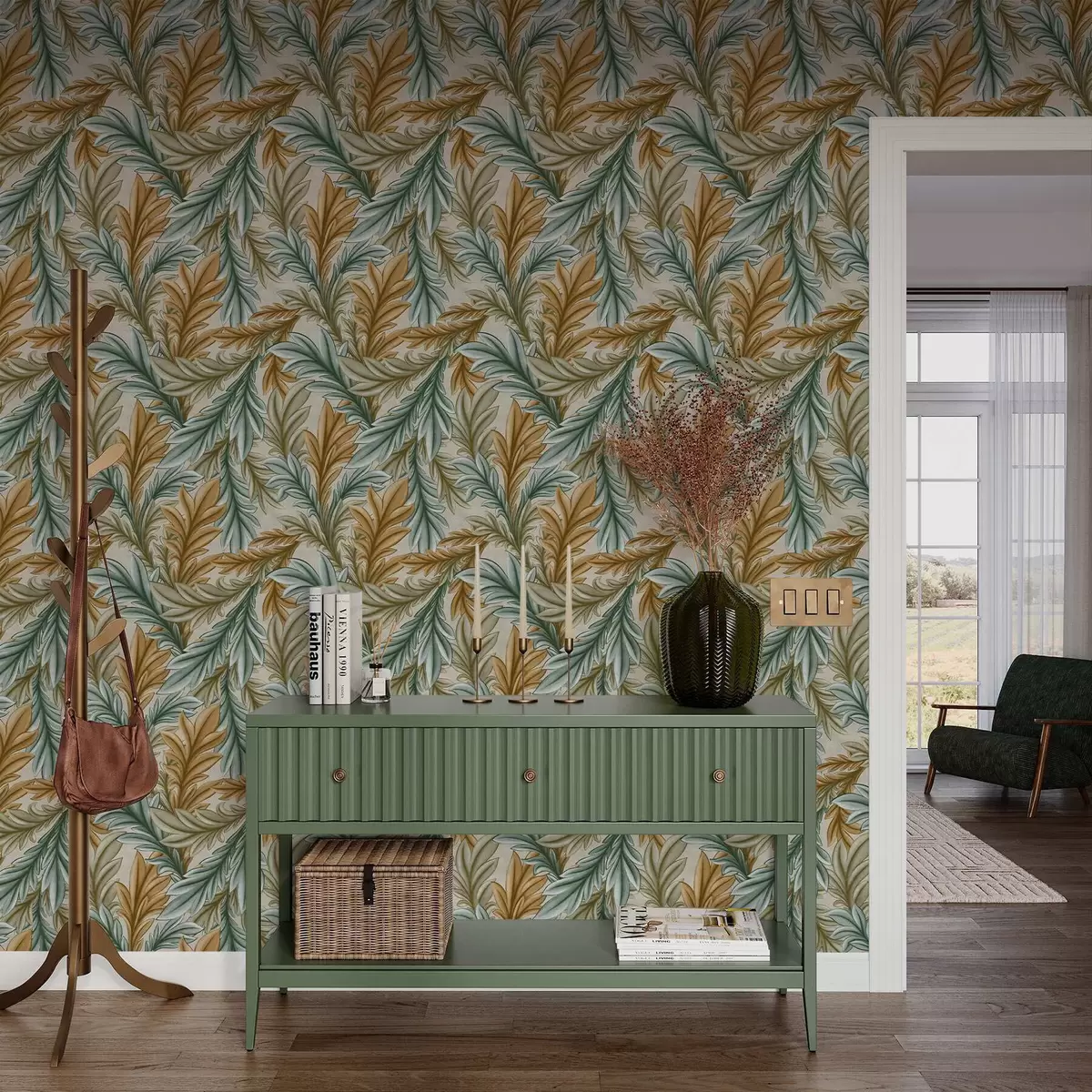 Ταπετσαρία Διακοσμητικό φύλλωμα σε ζεστή παλέτα από ώχρα και πράσινο Nr. a00673