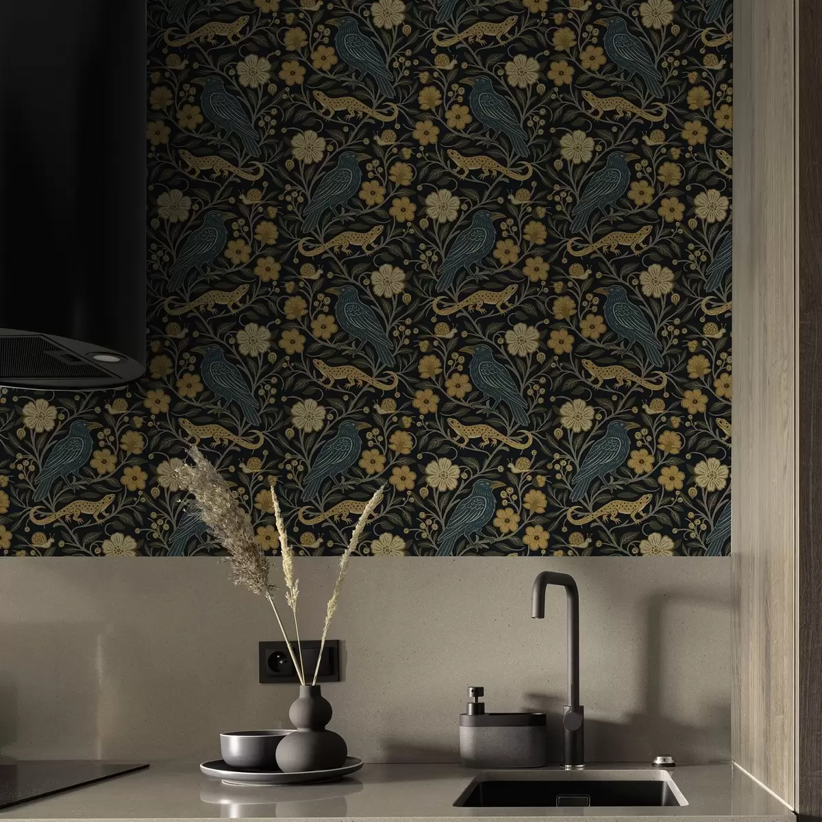 Ταπετσαρία Πουλιά, σαύρες και σαλιγκάρια ανάμεσα σε λουλούδια σε σκούρο φόντο Nr. a00691
