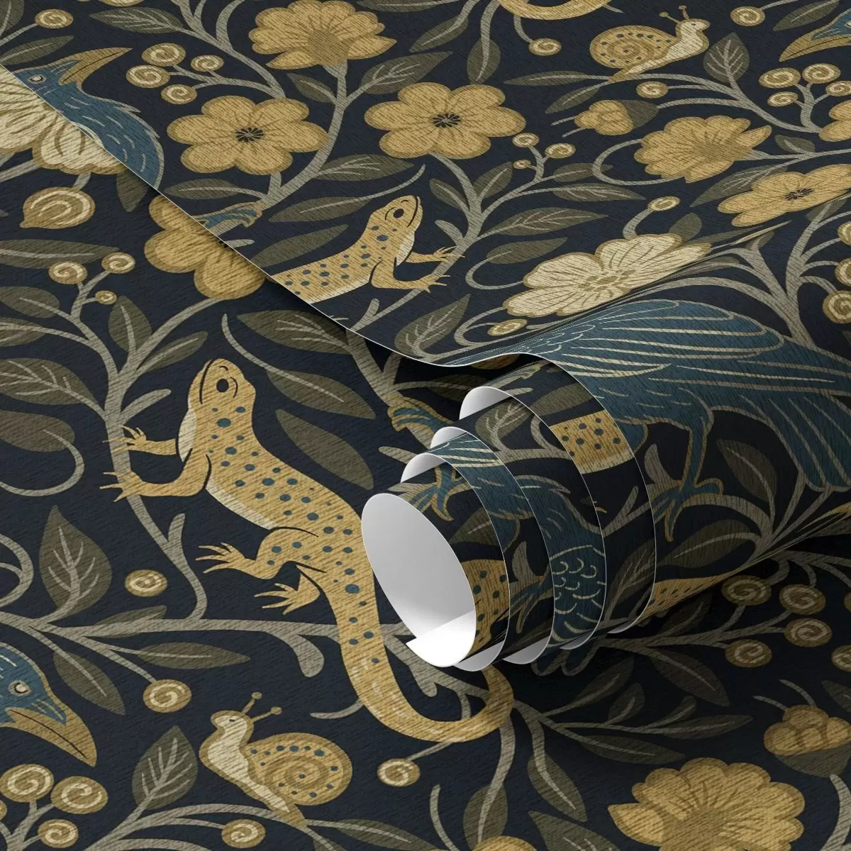 Ταπετσαρία Πουλιά, σαύρες και σαλιγκάρια ανάμεσα σε λουλούδια σε σκούρο φόντο Nr. a00691