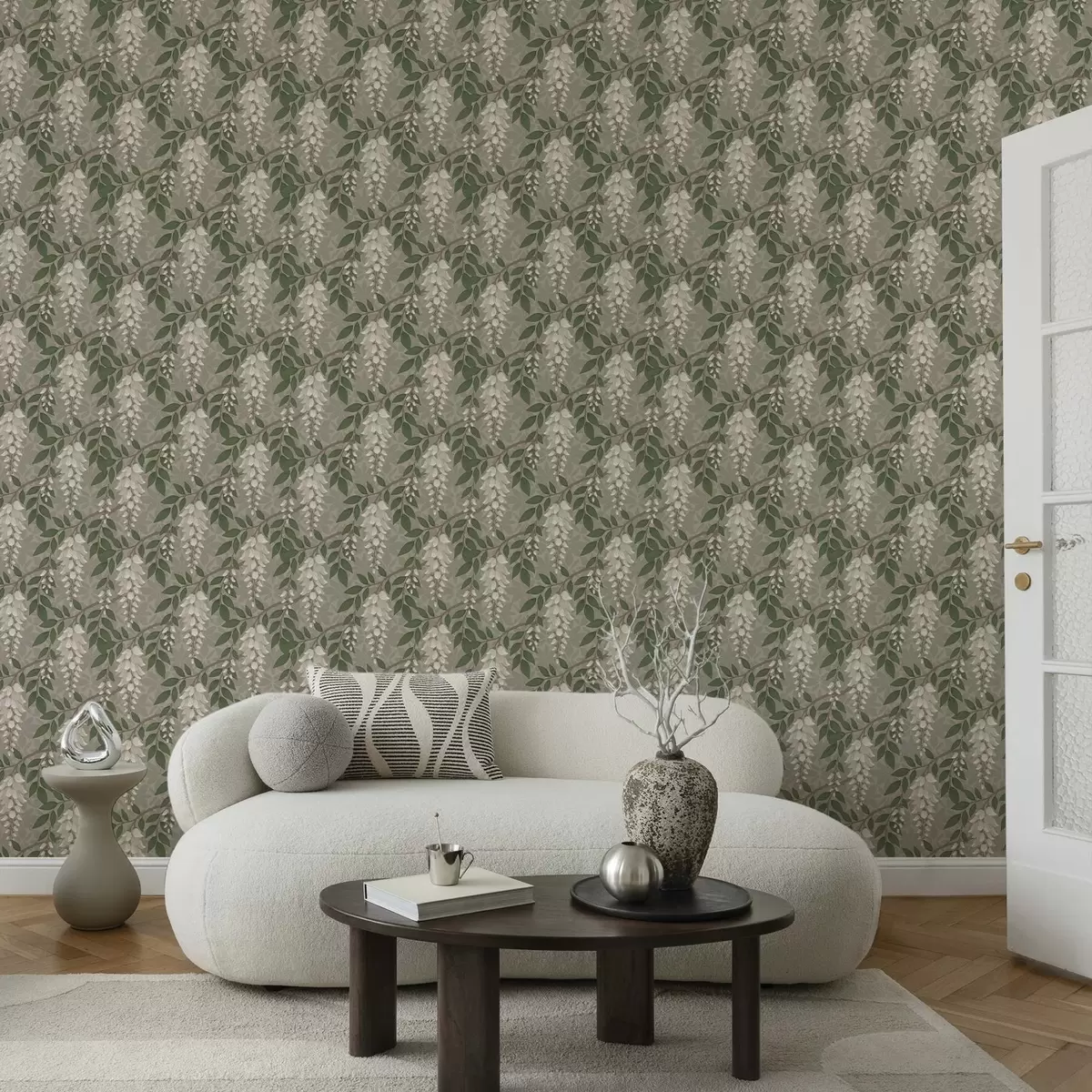 Ταπετσαρία Ανοιχτόχρωμη γλυκίνη σε φόντο γκρι-ελιά, καταρρακτώδεις συστάδες Nr. a00694