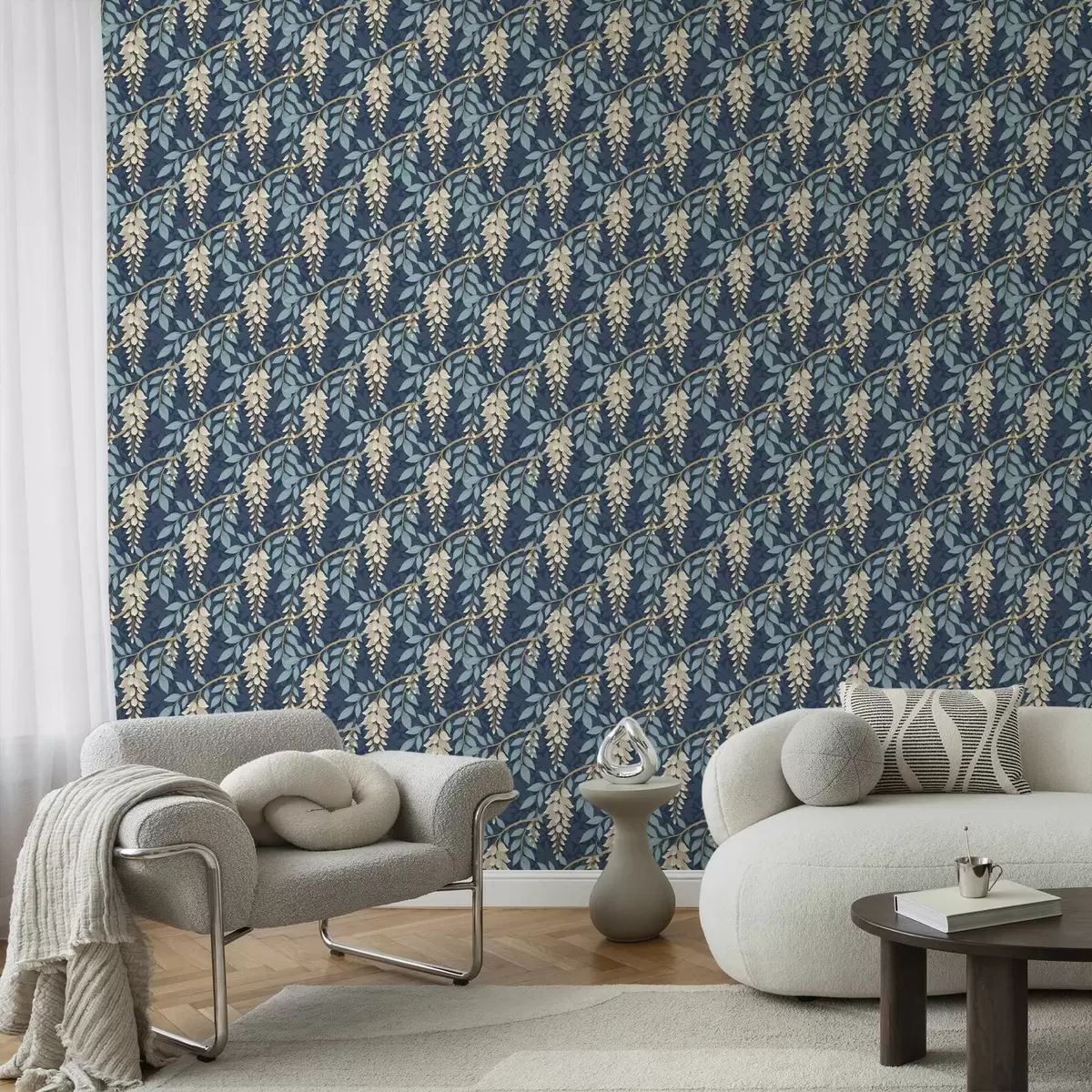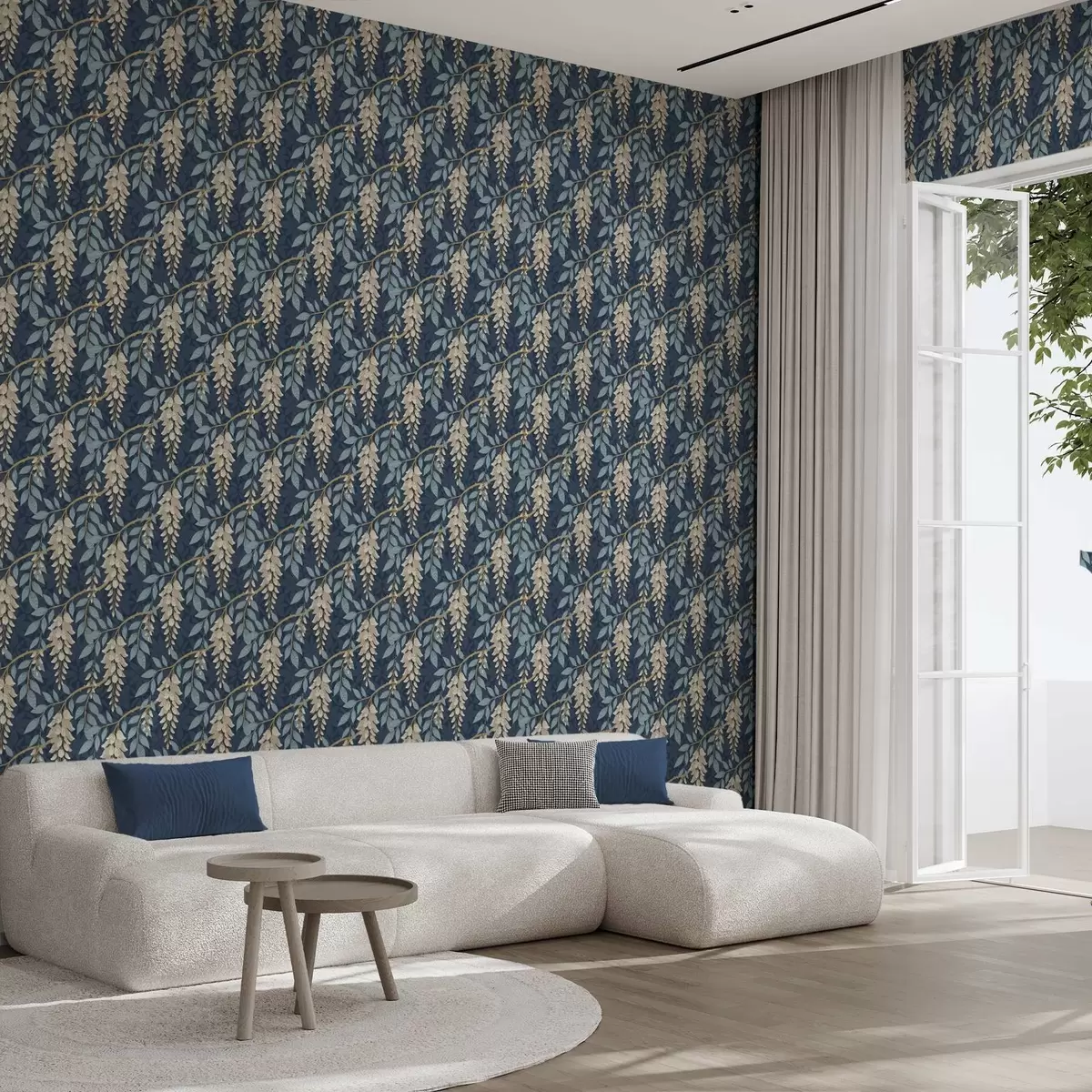 Ταπετσαρία Γλυκίνη με μπλε φύλλα σε σκούρο μπλε φόντο Nr. a00694v2