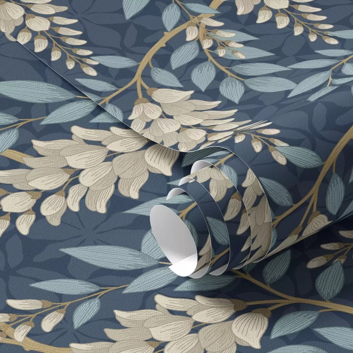 Ταπετσαρία Γλυκίνη με μπλε φύλλα σε σκούρο μπλε φόντο Nr. a00694v2