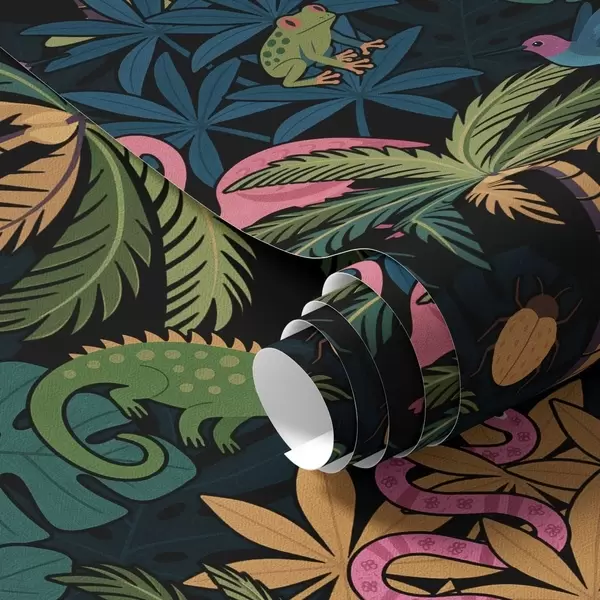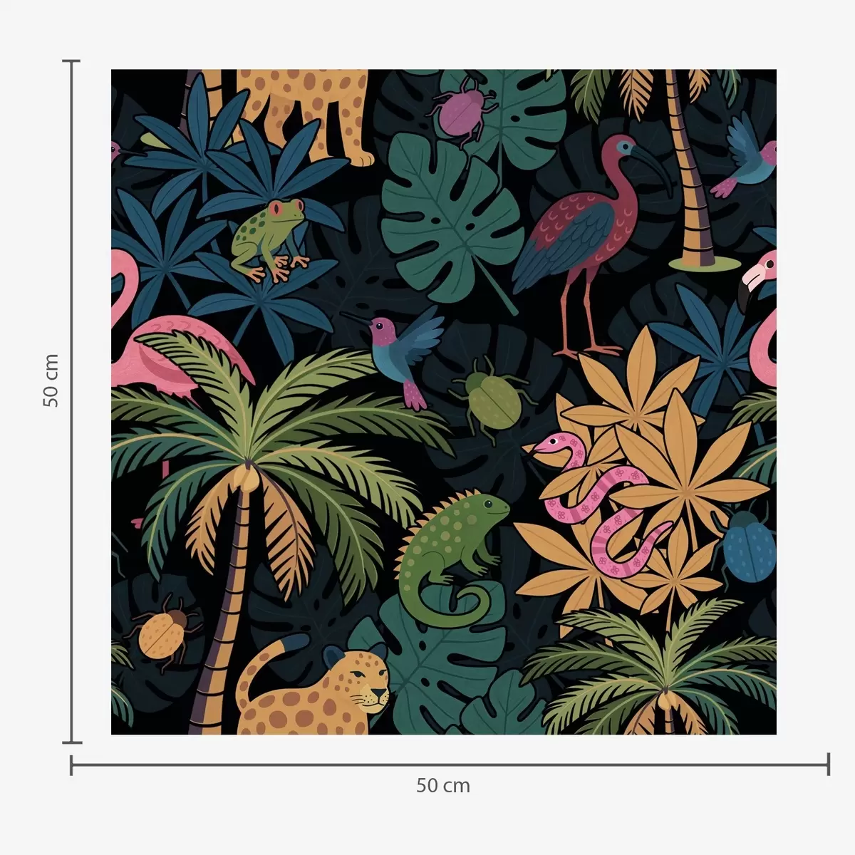 Ταπετσαρία Φωτεινά τροπικά ζώα ανάμεσα σε φύλλωμα σε σκούρο φόντο Nr. a00701