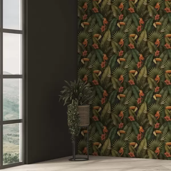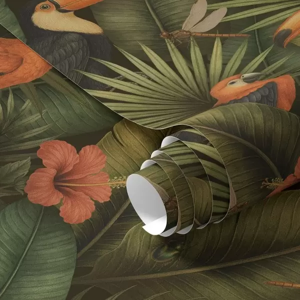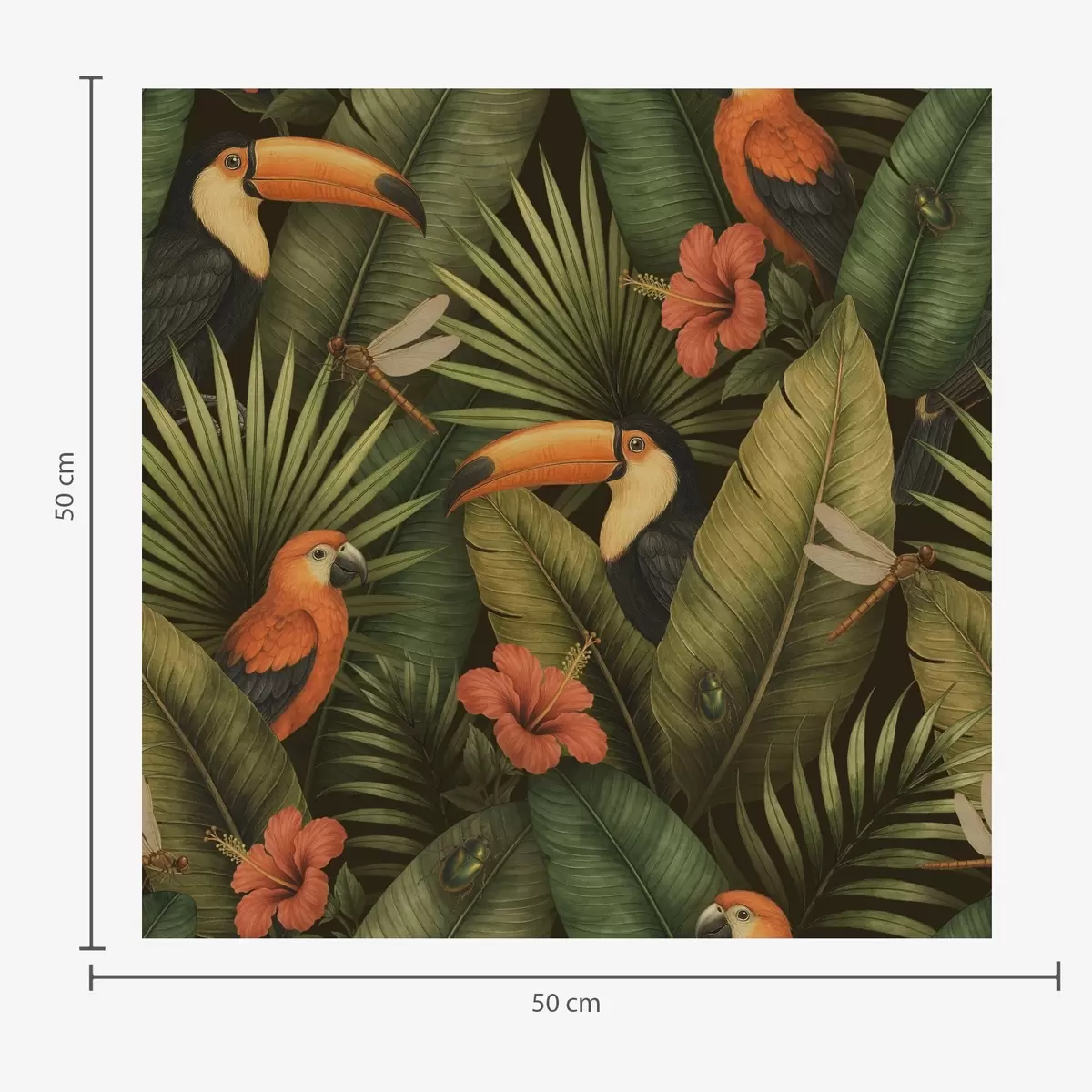 Ταπετσαρία Τουκάν και παπαγάλοι ανάμεσα σε τροπικά φυλλώματα και λουλούδια Nr. a00702