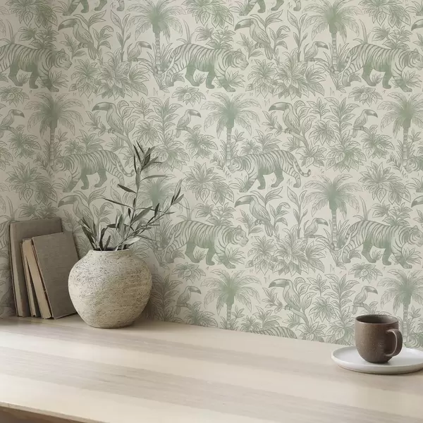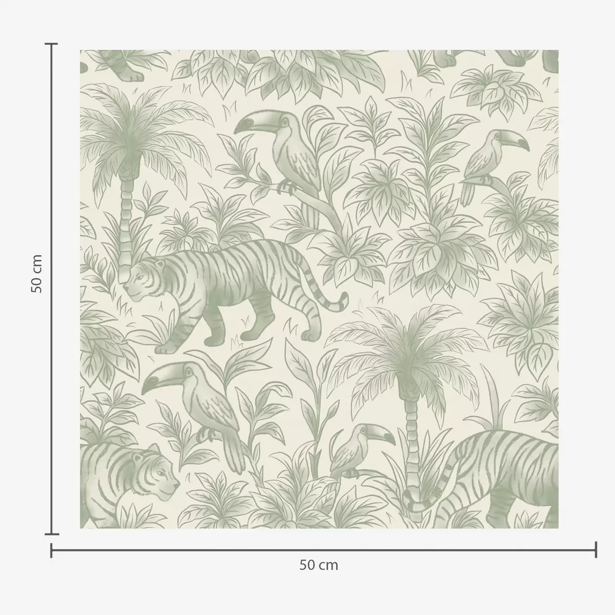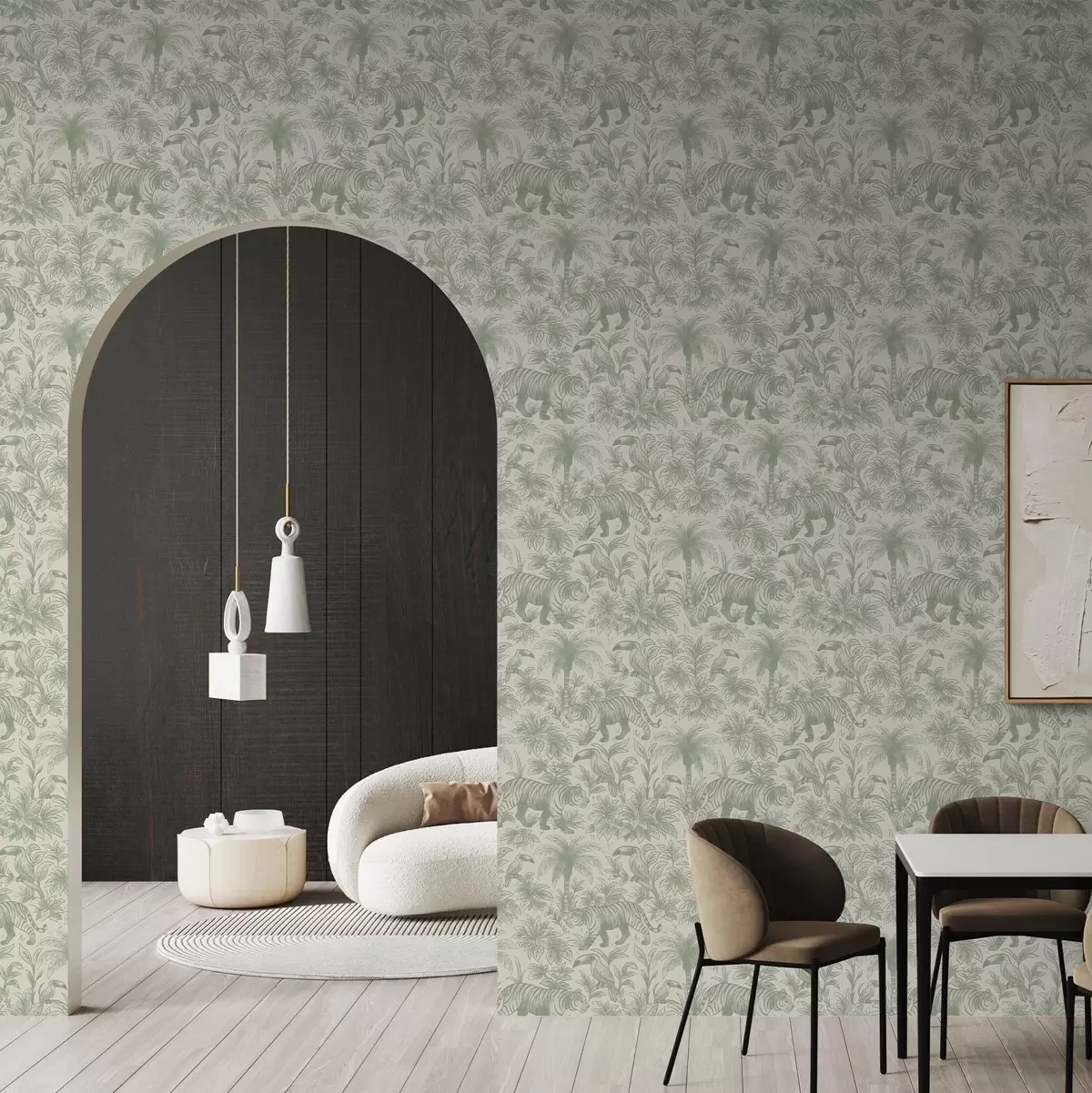 Ταπετσαρία Τίγρεις και τροπικά πουλιά ανάμεσα σε φοίνικες σε ανοιχτόχρωμο φόντο Nr. a00711