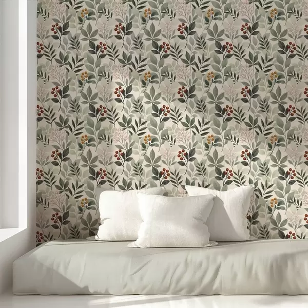Ταπετσαρία Φύλλα με μούρα, ανοιχτόχρωμο φόντο Nr. a00713