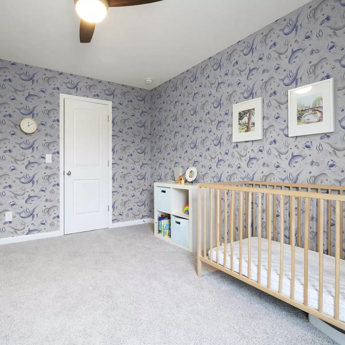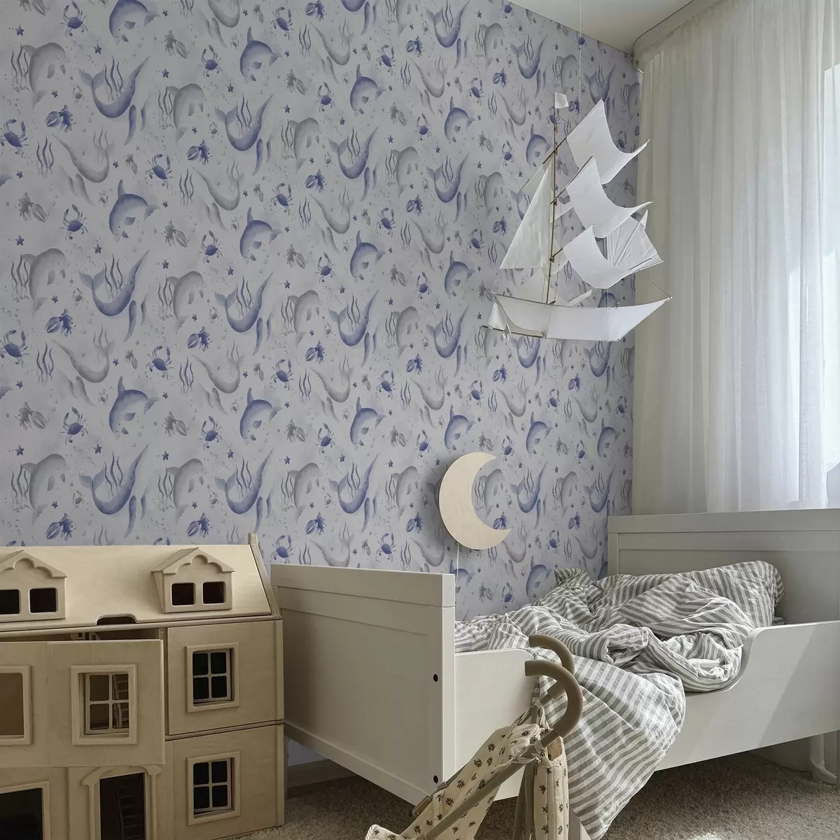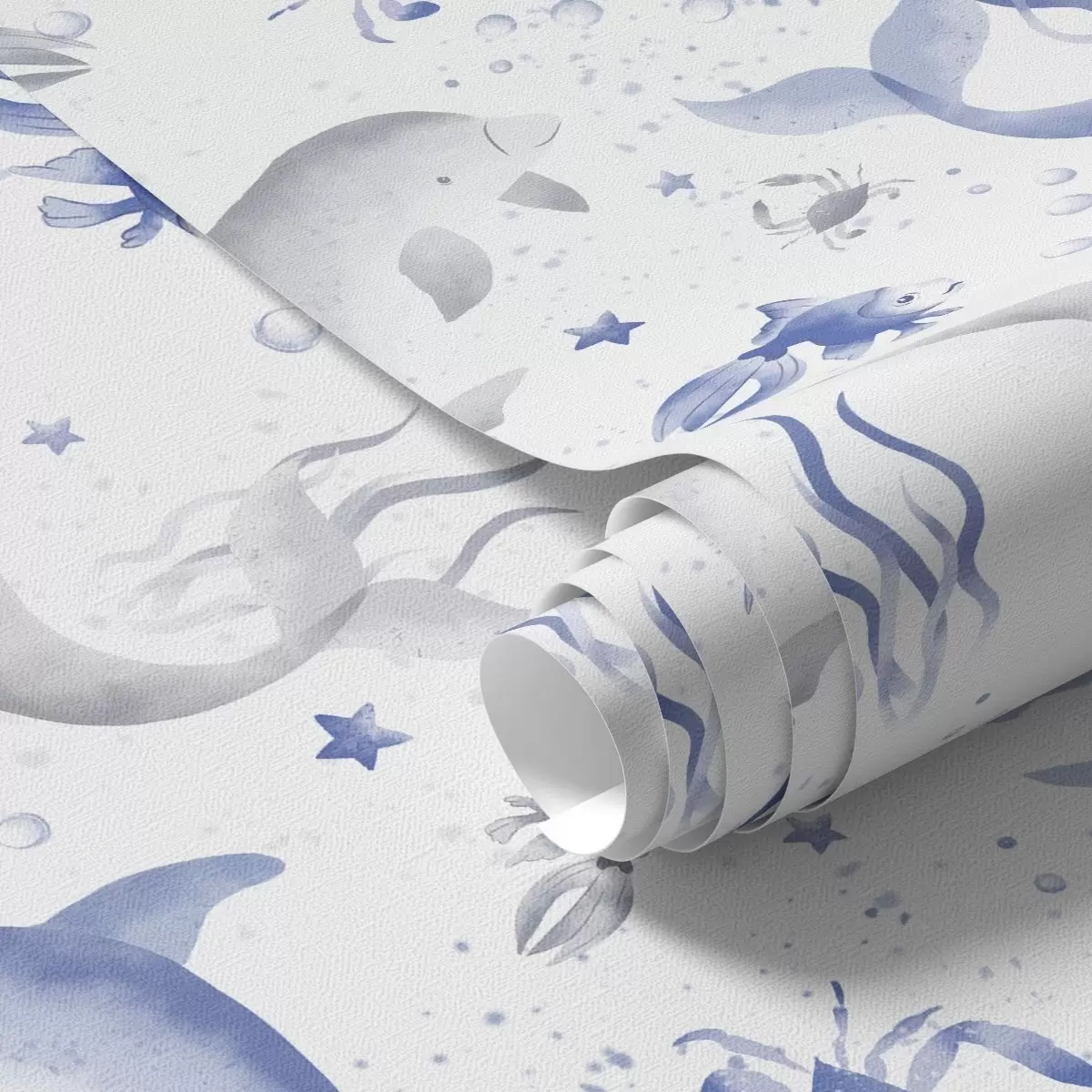 Ταπετσαρία Θαλάσσιες φάλαινες και δελφίνια σε μπλε αποχρώσεις σε λευκό φόντο Nr. a00720v1