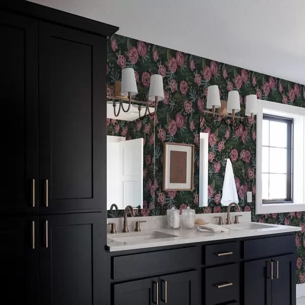 Ταπετσαρία Σκούρα χλωρίδα με ροζ λουλούδια και φύλλα, βαθύ φόντο Nr. a00724