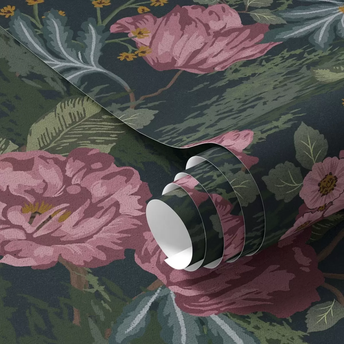 Ταπετσαρία Σκούρα χλωρίδα με ροζ λουλούδια και φύλλα, βαθύ φόντο Nr. a00724