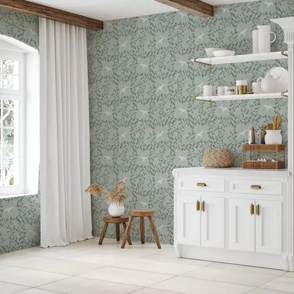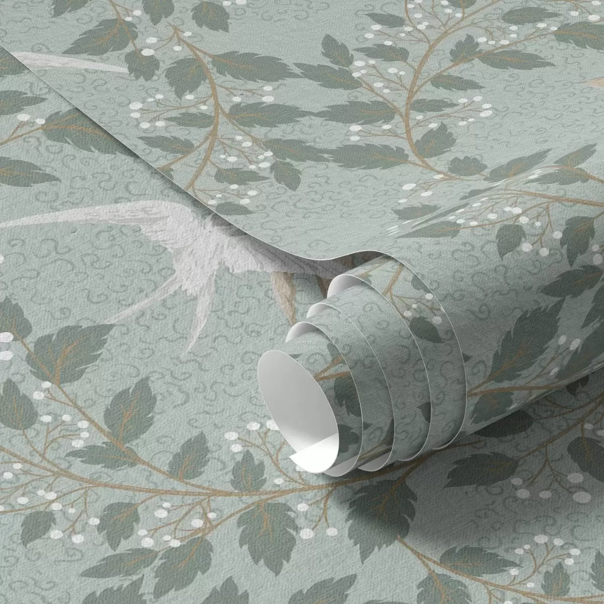 Ταπετσαρία Κλαδιά με λευκά μούρα και πουλιά σε πράσινο φόντο Nr. a00731