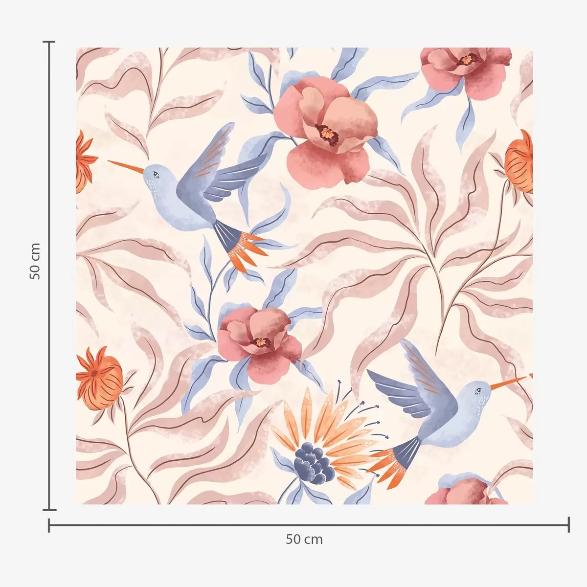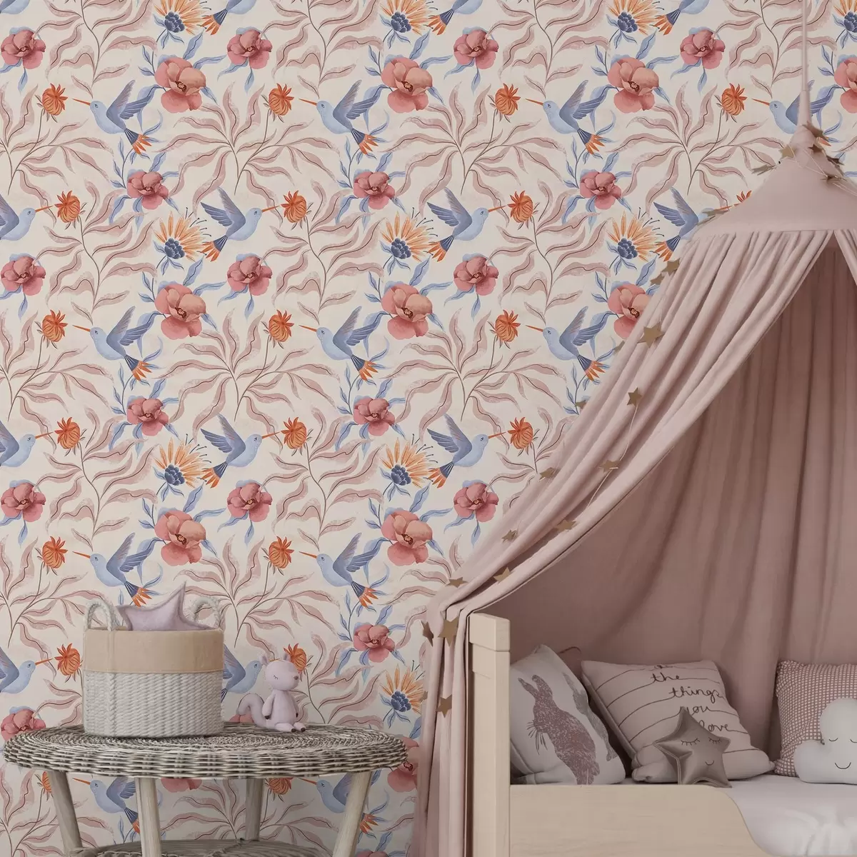 Ταπετσαρία Κολίβρια ανάμεσα σε μεγάλα λουλούδια σε ροζ και μπλε αποχρώσεις Nr. a00733